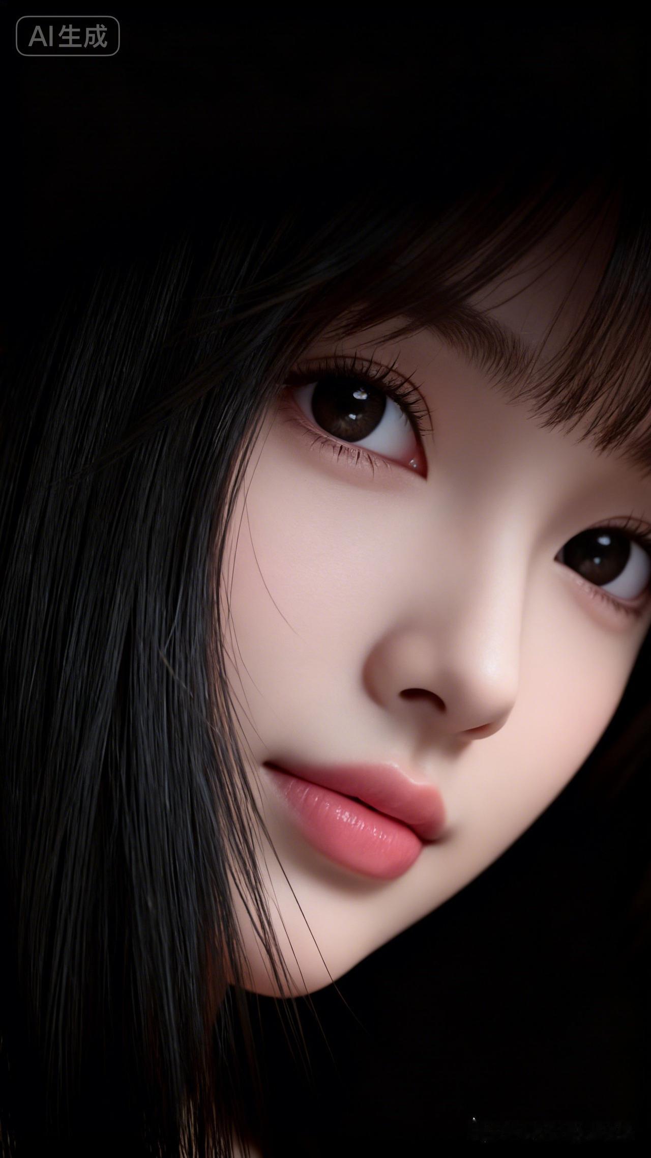 18岁少女绝美面部特写,哑光纯黑背景衬映。朦胧轮廓剪影交织,水润眼眸灵动坚定,唇瓣丰润饱满,发丝轻盈飘逸。压低整体光线,氛围感羞涩温婉,超精细CG质感,32K高清极致细节刻画。
