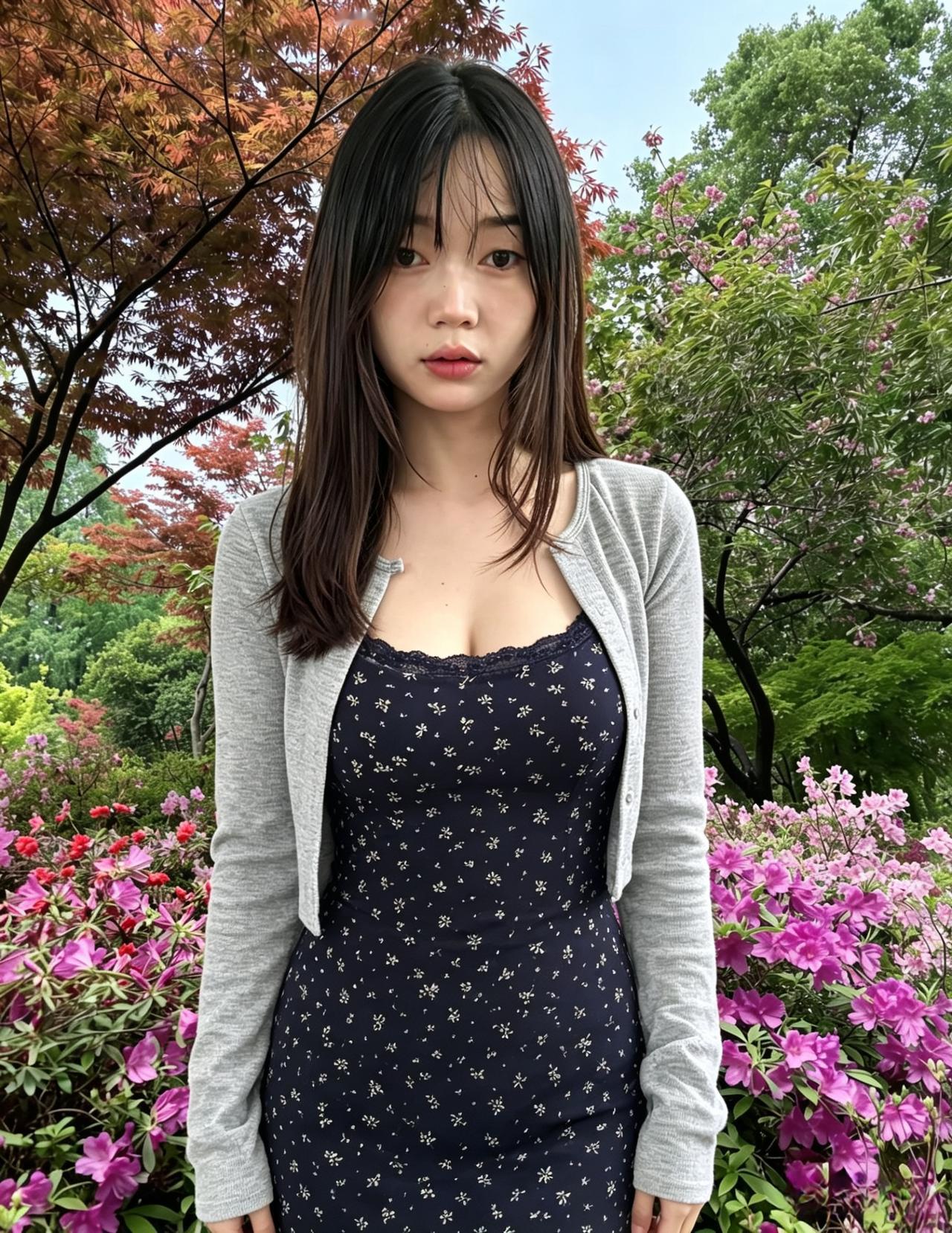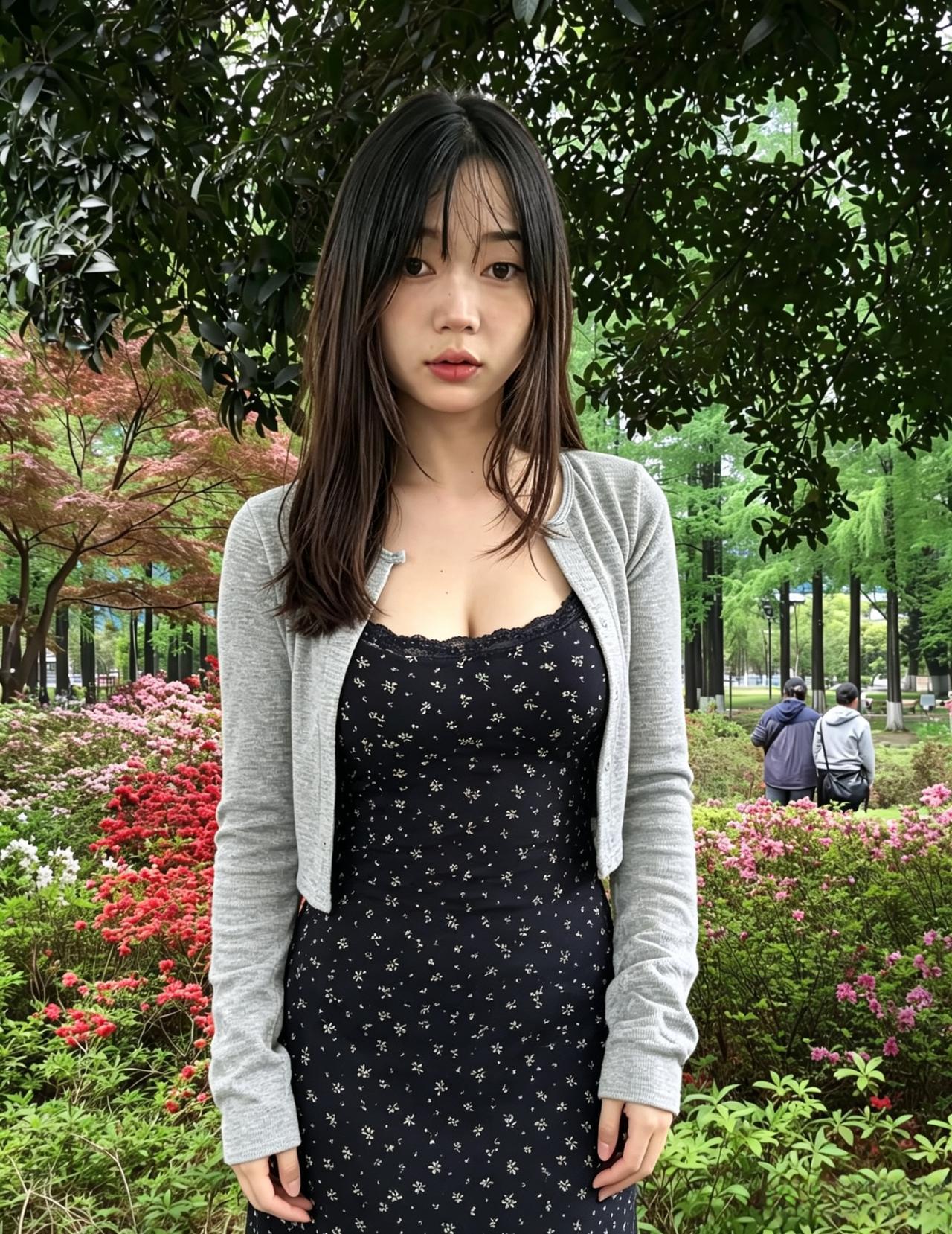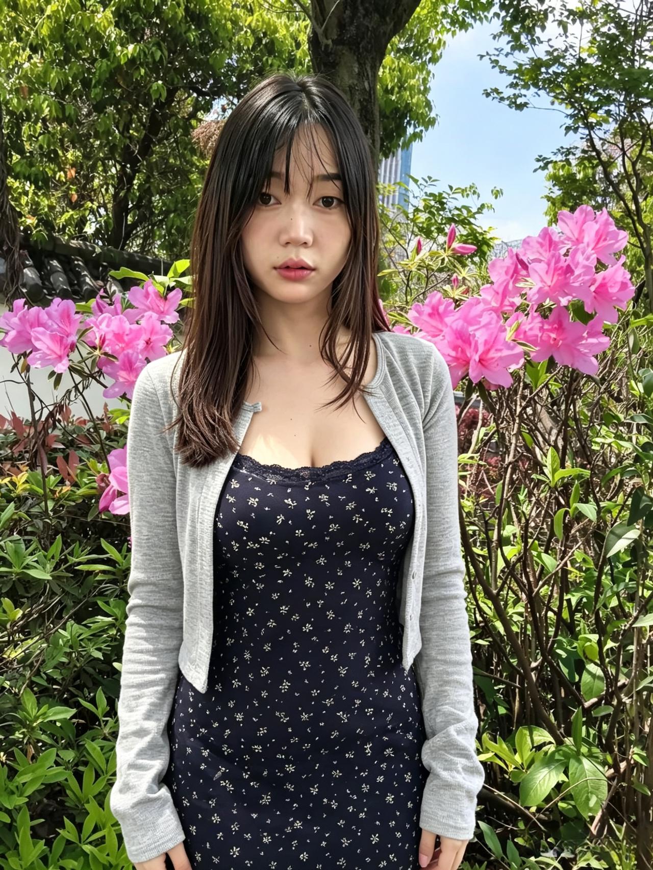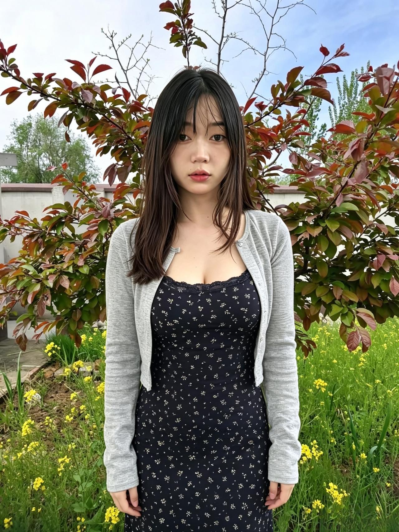 粉蕊盈枝映裙裳,玉容浅笑映晴光。 何须借得春颜色,花自因人添韵长。