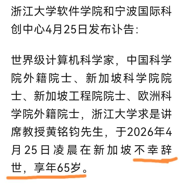 “不幸辞世”,什么意思?今天一早看到这条消息,心里咯噔一下——世界级计算机科学家黄铭钧院士,于2026年4月25日凌晨在新加坡“不幸辞世”,享年仅65岁。
