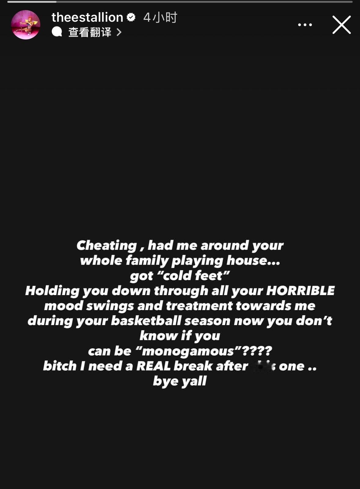 “ 出轨就算了 还带我见你全家 演了一出“过家家”的戏…结果你临阵退缩 不敢负责 整个篮球赛季我都陪着你扛着你那糟糕透顶的情绪波动和你对我的恶劣态度 结果现在你跟我说,你不知道自己能不能做到“专一”????跟你这一段感情之后,我真的需要彻底休息一下了…各位再见。