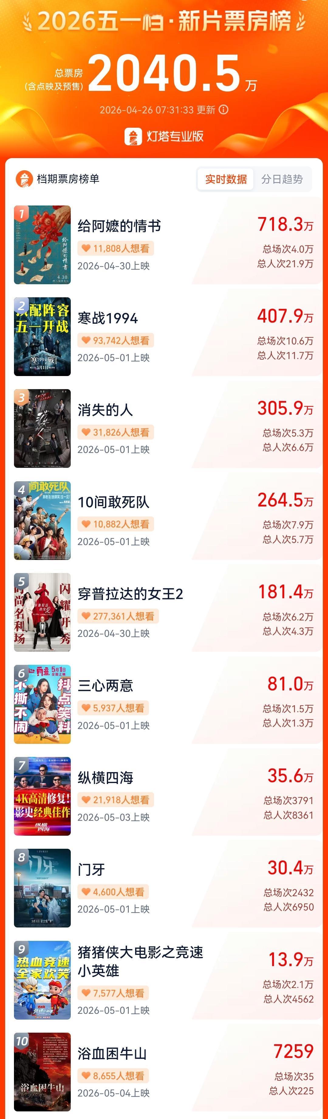 【2026五一档新片预售票房破2000万】财联社4月26日电,据灯塔专业版数据,截至4月26日0时22分,2026年五一档新片点映及预售总票房突破2000万元,《给阿嬷的情书》《寒战1994》《消失的人》《10间敢死队》《穿普拉达的女王2》暂列前五名。
