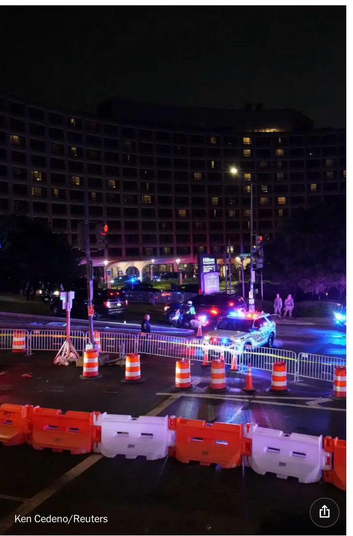 周六晚上,在听到几声巨大的砰砰声后,特朗普总统被紧急护送离开白宫记者晚宴。这是在华盛顿希尔顿酒店举办的活动。