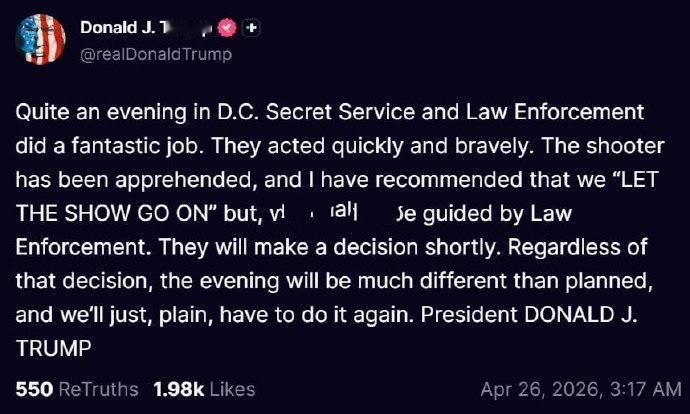 4月25日,在白宫发生突发事件,相信大家也都看到了,当时白宫正在举行2026年记者晚宴。