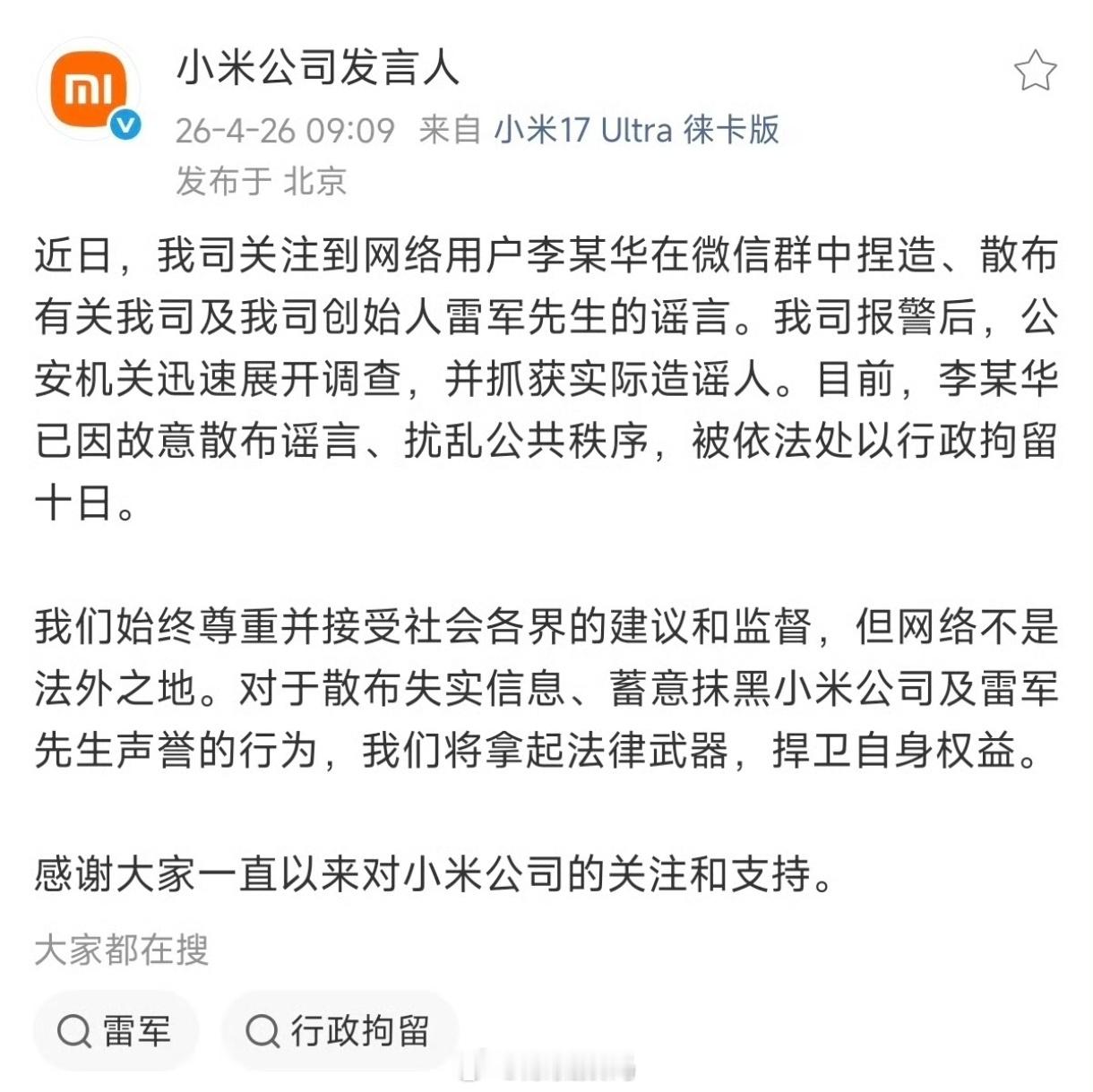 造谣「雷军被人堵在车里维权」的李某华,直接被警方拿下,依法行政拘留十日!