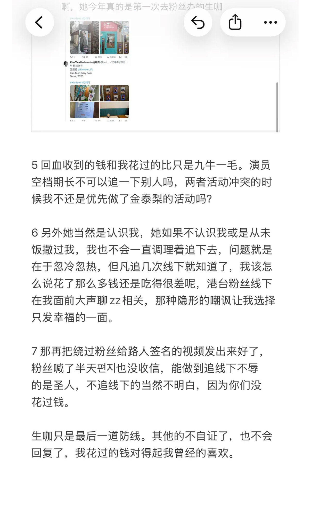 质问为什么其他人要把办理生咖的成果安到印尼粉丝身上,说金泰梨去别的粉丝的生咖并不是提前告知,生日蛋糕有中文也只是电视剧相关。