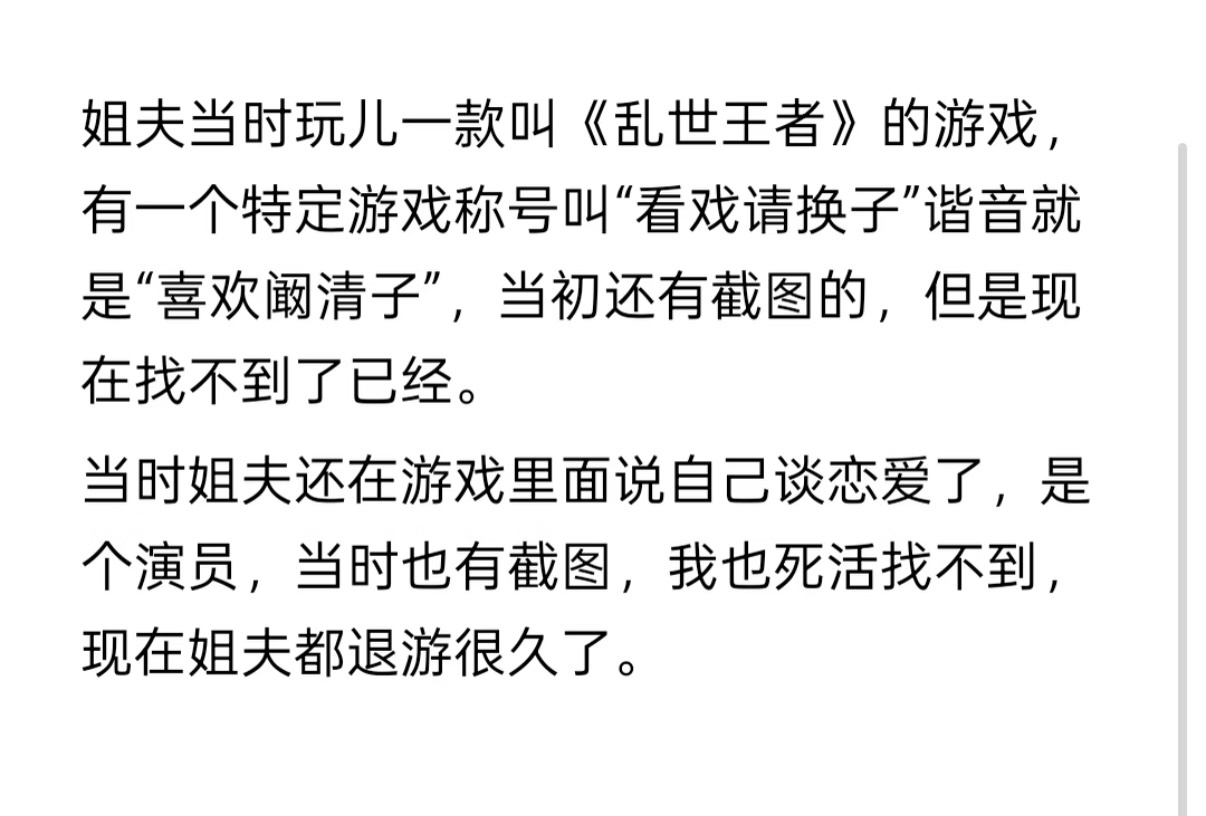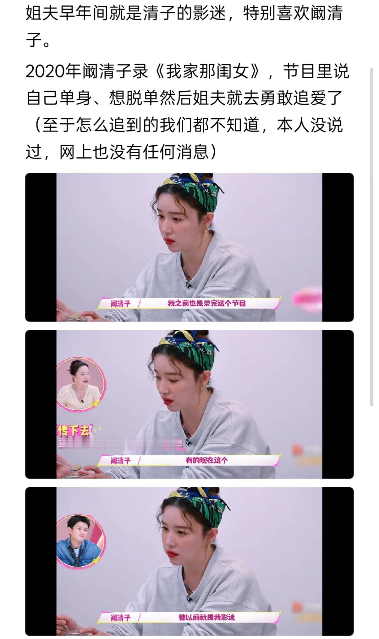 早年就是阚清子的影迷,是追了姐姐的综艺看到她说想脱单才勇敢追爱的游戏id还是“喜欢阚清子”,后来直接包了个小岛打扮成王子给姐姐求婚!平时一起出游也是姐夫提大行李