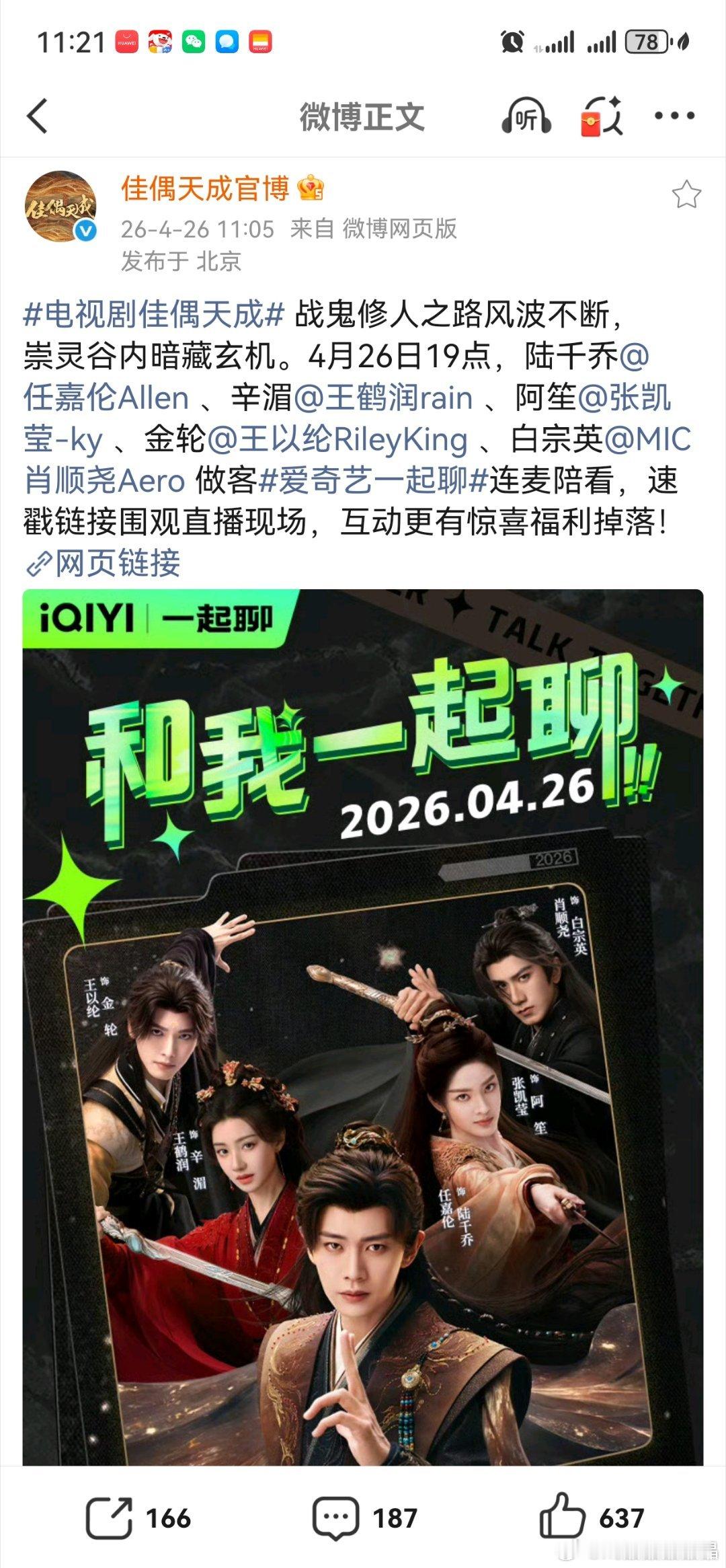 任嘉伦和《佳偶天成》其他主演今晚在爱奇艺和腾讯直播陪看,19点在爱奇艺,19点5