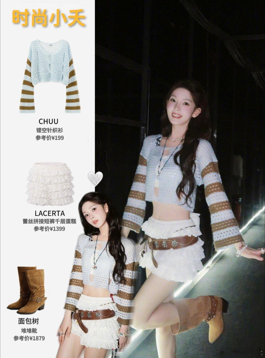 下装:LACERTA 蕾丝拼接短裤千层蛋糕裙 白色蕾丝拼接的多层蛋糕短裙,层次感非常丰富,自带甜美和浪漫气息。陈瑶在腰间搭配了一条棕色铆钉皮带,为整体造型注入了硬朗的西部牛仔元素,平衡了裙子的甜腻感。鞋子:面包树 堆堆靴 棕色绒面材质的尖头堆堆靴,靴筒自然堆叠,带有西部牛仔靴的风格,与腰带相呼应,强化了整体的复古和帅气感。穿搭风格解析