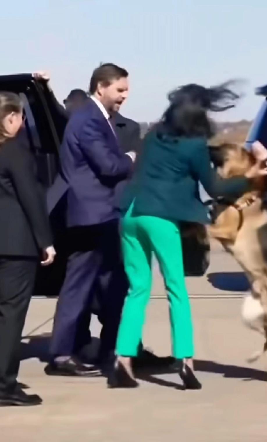 万斯和狗,和一个穿绿裤子的女人。