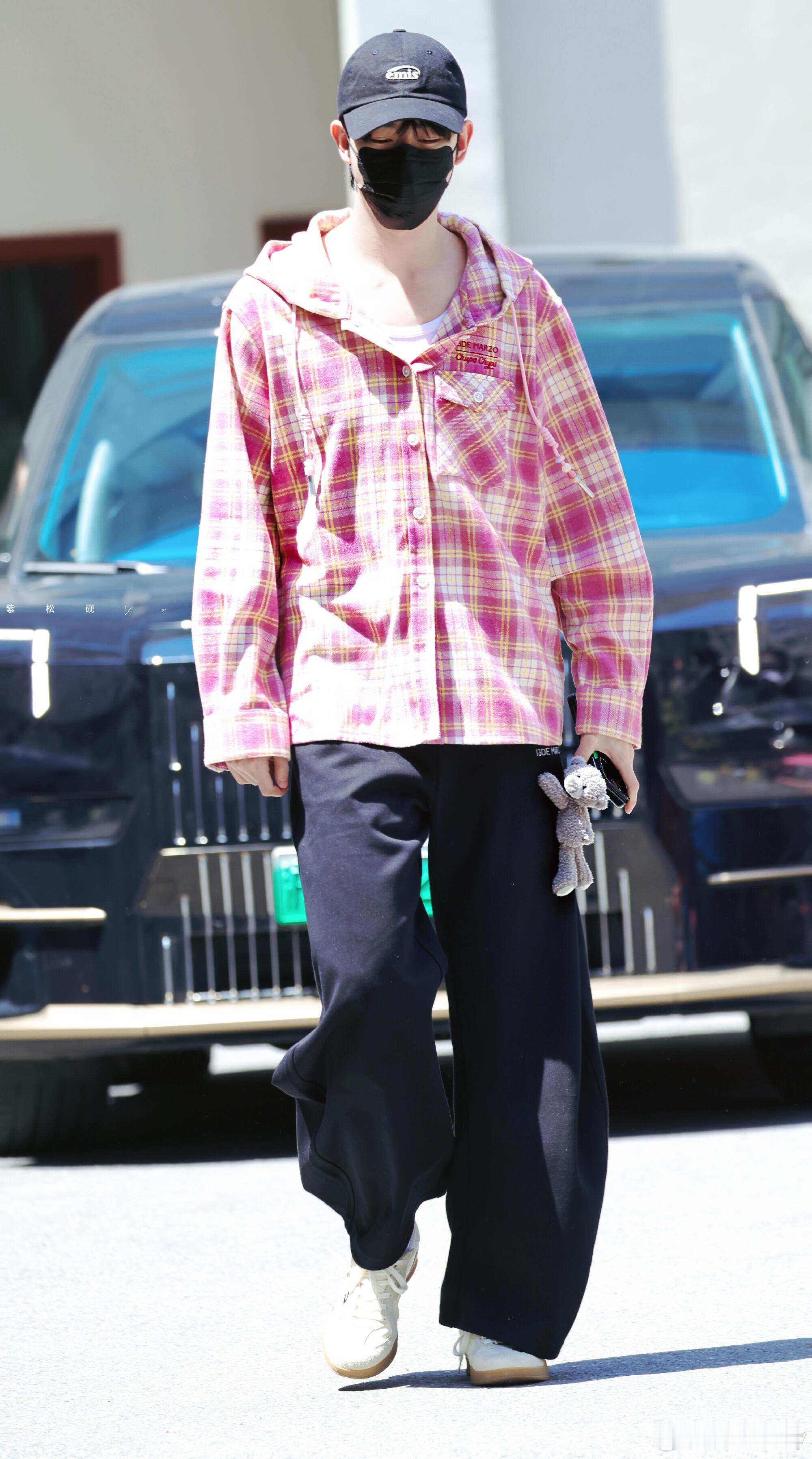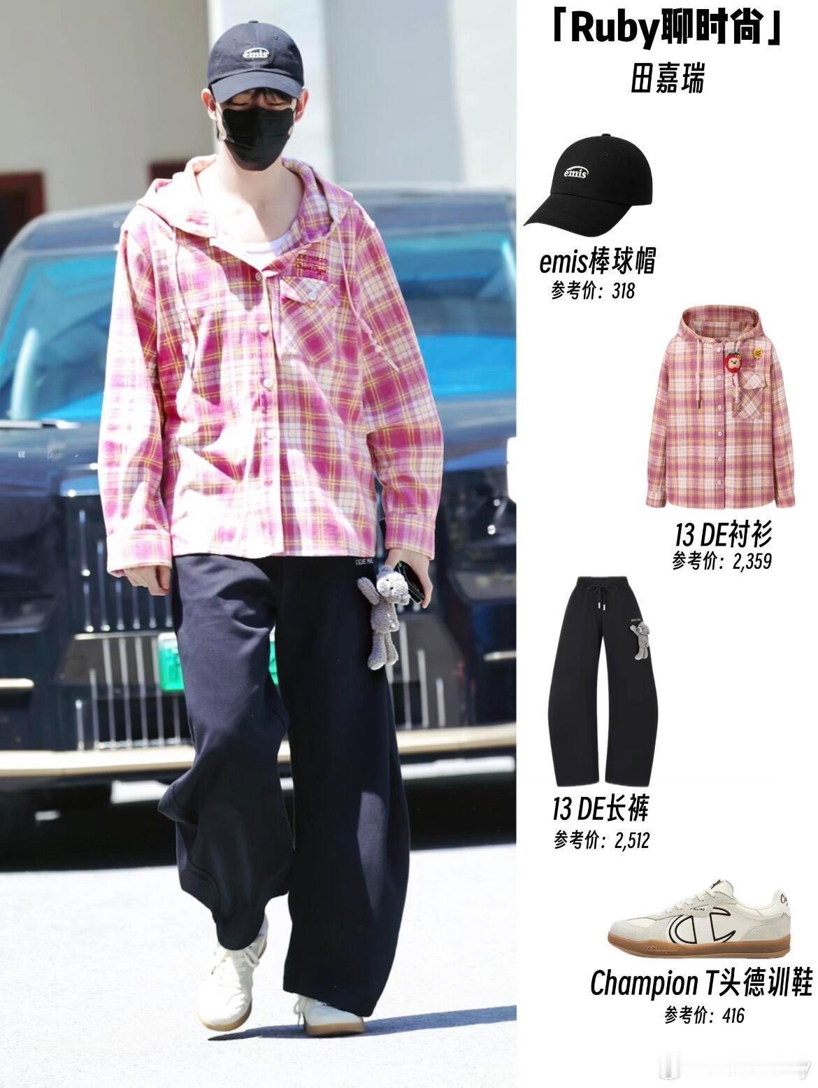 260426|田嘉瑞夏日清爽男友风天花板• 粉格连帽衬衫:这件粉调格纹衬衫自带软乎乎的元气感,连帽设计打破了常规衬衫的正式感,多了几分随性的少年气,宽松版型单穿当外套都超合适,瞬间把夏日的甜酷氛围拉满。• 黑色阔腿长裤:垂坠感满分的黑色阔腿裤,和宽松衬衫形成了“上宽+下宽”的平衡感,裤腿上的小玩偶挂件更是点睛之笔,让基础款裤子瞬间有了专属记忆点,随性又不单调。• 黑白德训鞋+棒球帽:低饱和的德训鞋和黑色棒球帽,完美中和了粉格衬衫的亮眼感,整体造型色彩清爽不杂乱,自带韩系街头感,日常出街穿舒服又耐看
