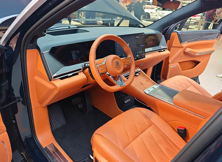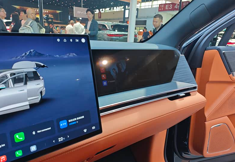内饰触目可见就是屏幕,主副驾+中控娱乐屏幕,还有个HUD抬头显示,该有的都给配上了。