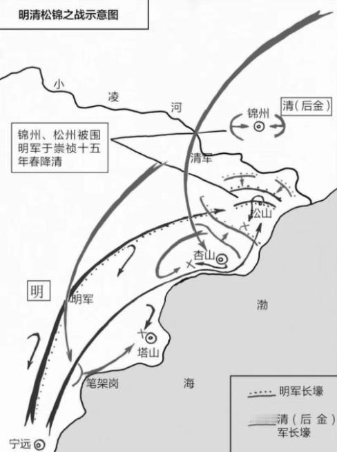 崇祯十五年(1642年)二月十八日,松山副将夏承德降清,清军攻破松山城,洪承畴被俘,松山失守后,锦州守军待援无望,粮尽人相食,祖大寿于三月八日献锦州投降,四月九日,清军攻破塔山,歼灭明军七千人;四月二十二日,清军以红衣大炮炸毁杏山城,明军投降。