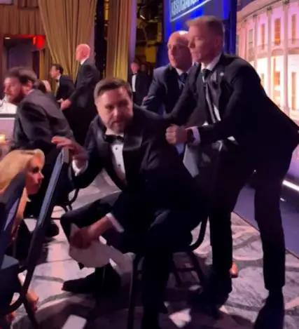 枪击事件发生后,晚宴现场陷入一片混乱,特朗普被带离现场时,还摔了一个大跟头。枪响后副总统万斯被特勤人员一把拽走,而特朗普紧随其后,引发美国网民质疑。从现场发出的图片看,整个撤离过程被演绎成为一个妥妥滴抓捕和押解现场。