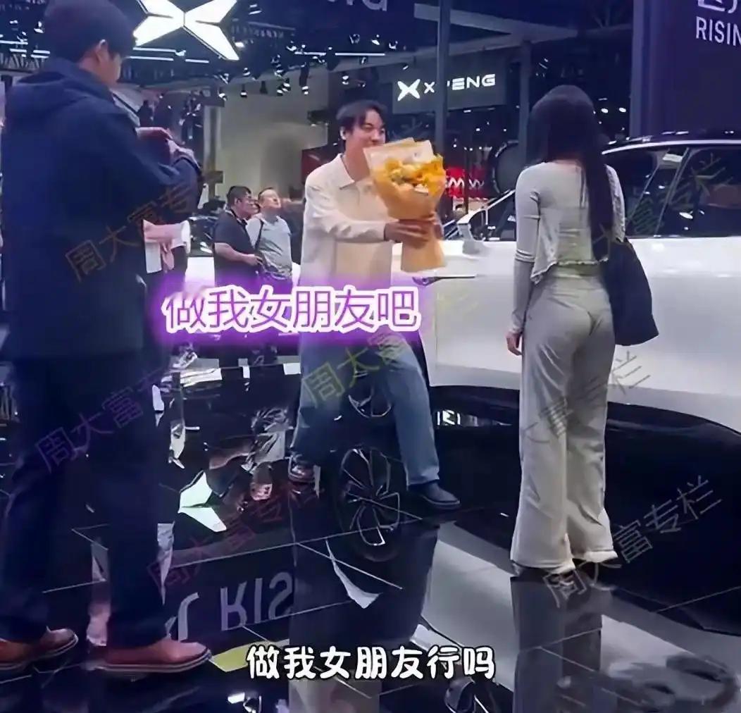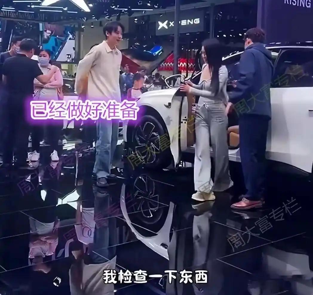 视频显示,一个豪华品牌的新能源展台前,围了不少人。人群中,一对年轻男女格外显眼——男的穿着得体,女的打扮精致,两人围着一辆展车转了好几圈