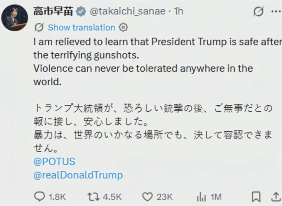 点评:看把高市早苗急得,赶紧发一条关心特朗普的推文,高市早苗发文关心特朗普,一方面可以吸引特朗普的注意,高市早苗想让特朗普知道她很关心他很在意他,同时让特朗普知道日本是美国的坚定盟友,从而为日本以后的各种解禁措施寻求特朗普的支持。