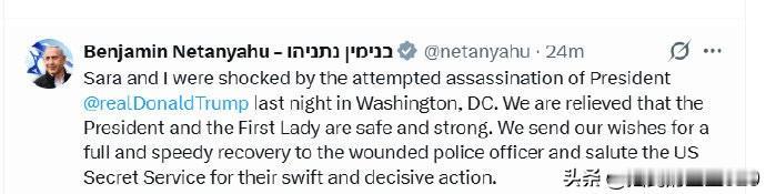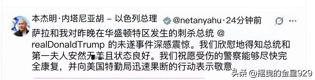 内塔尼亚胡表示,他对美国总统特朗普和第一夫人梅拉尼娅在事件中安然无恙且状态良好表示欣慰。并祝愿受伤的警官早日康复。