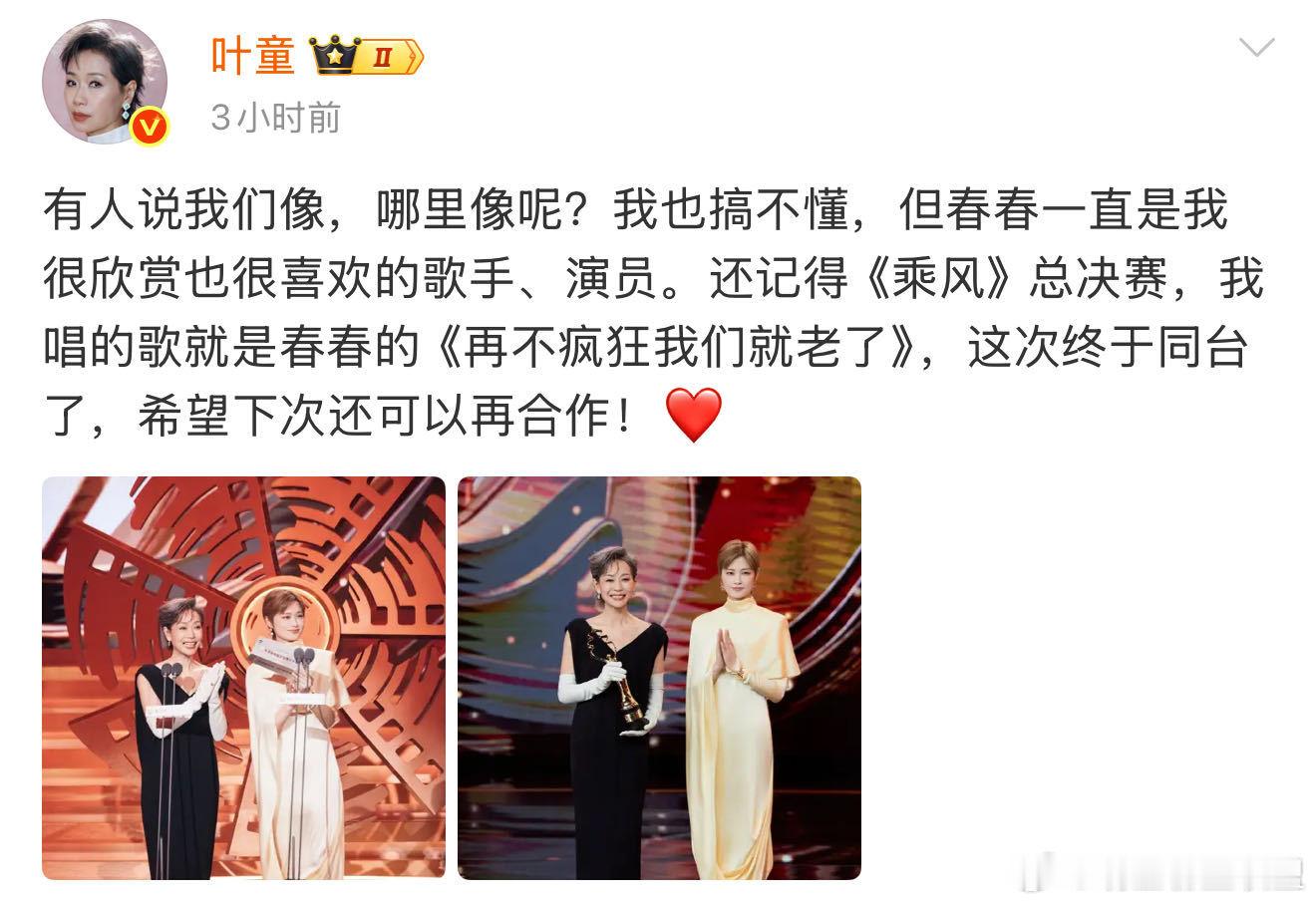 叶童晒与李宇春合照 神仙合体!叶童李宇春同框合照,很像跨越时代的双向气质共鸣,老牌港风女神+实力歌手,这波同框联动好强~