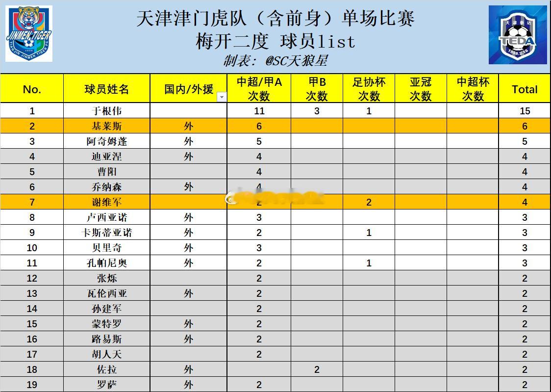 8. 郭皓14次代表津门虎(含前身),联赛对阵国安,依然是队内球员最高。之后是王秋明和谢维军的13场(P8)