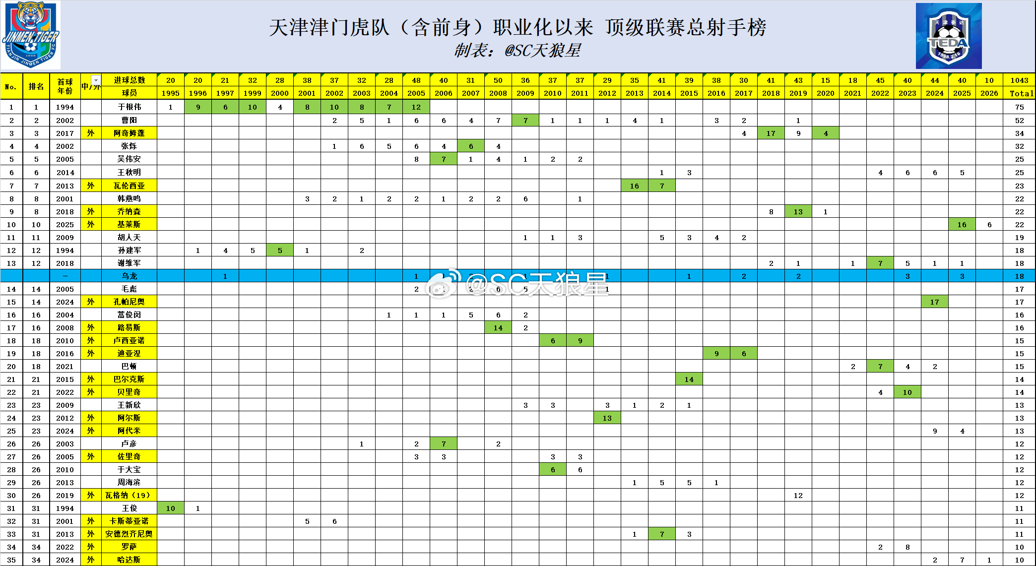 10. 目前球队在联赛中的前11粒进球,全是外援打入,这是职业化以来首次。