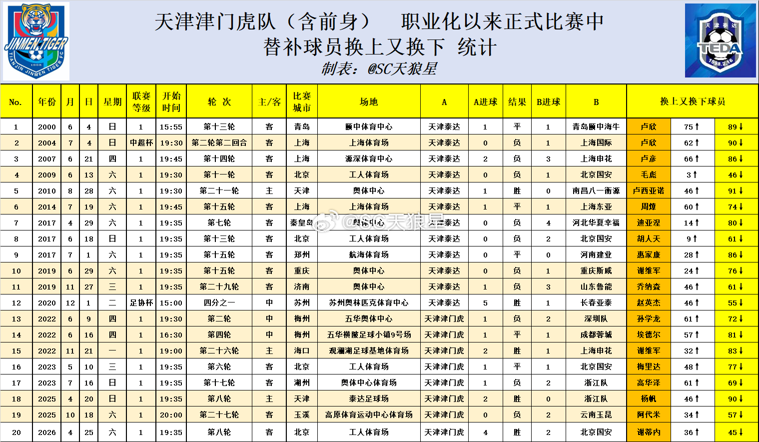 6. 职业化以来,谢蒂内成为第20位,在正式比赛中换上又换下的球员(P6)