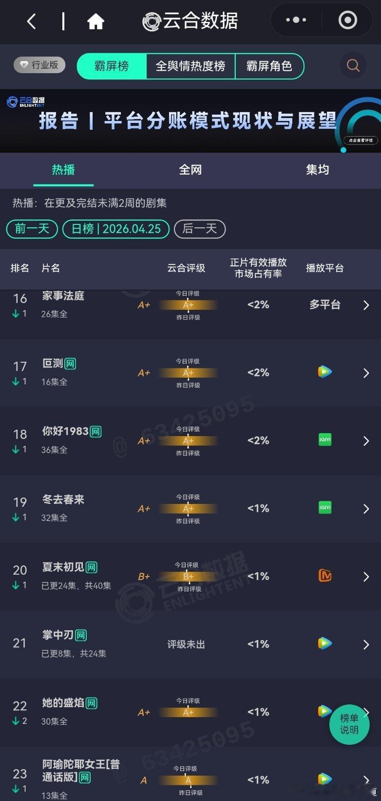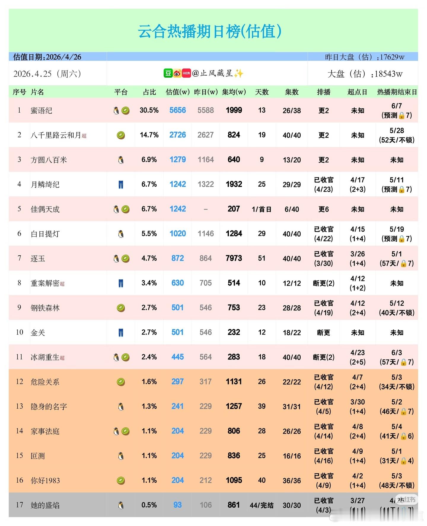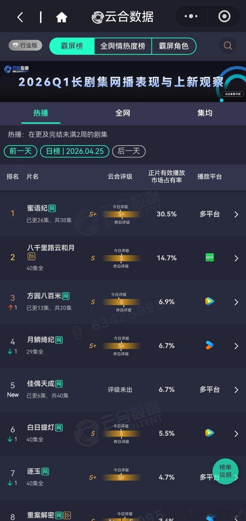 4月25日云合播放占比云合 VS酷云蜜语纪意外的强悍。佳偶天成没什么宣发的情况下