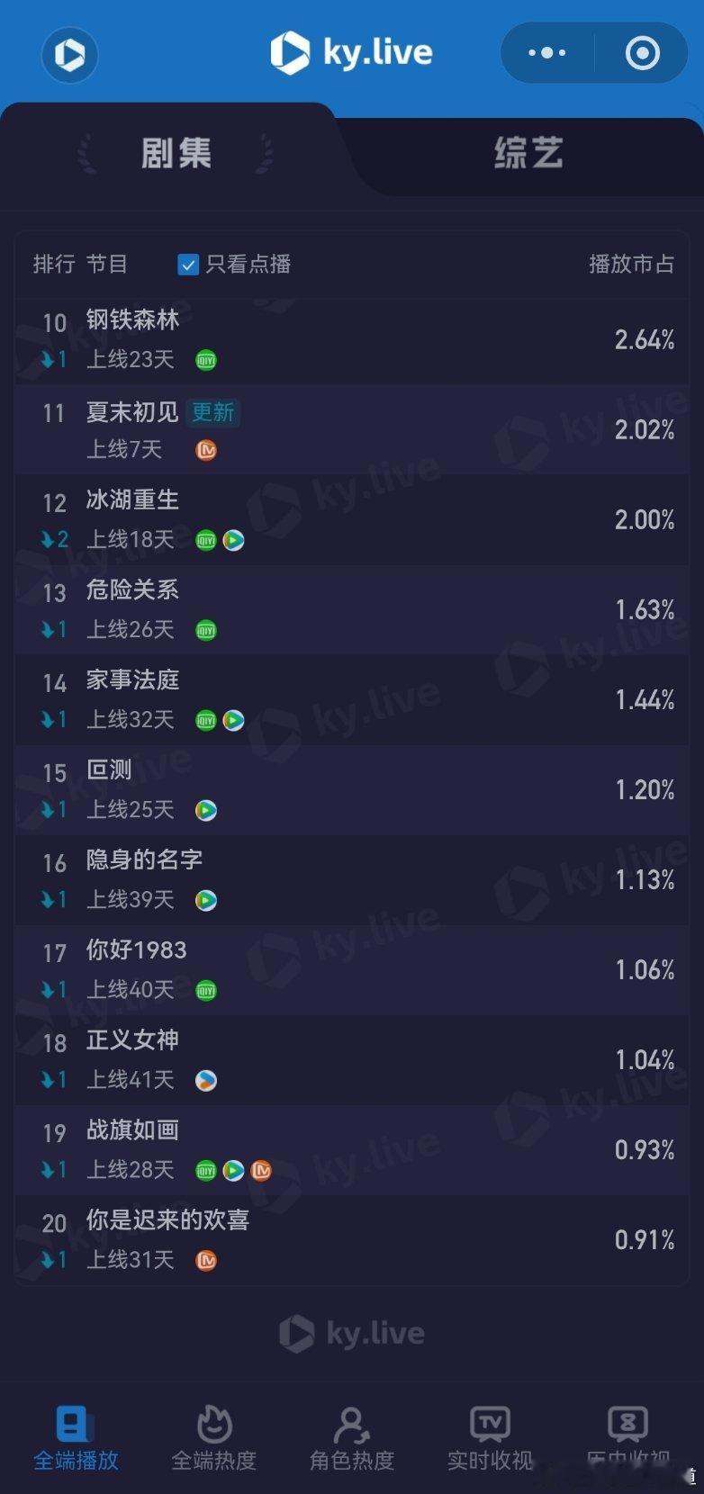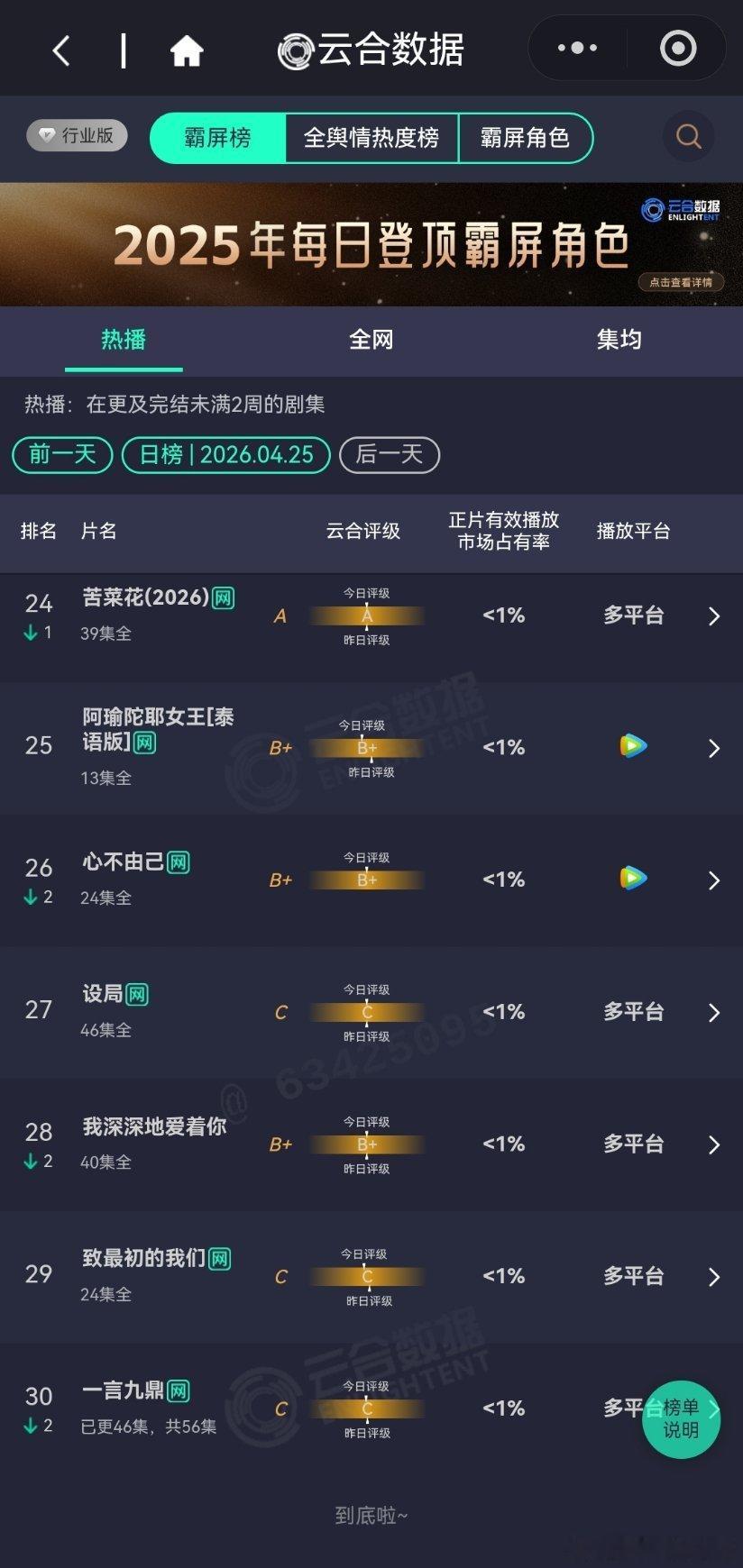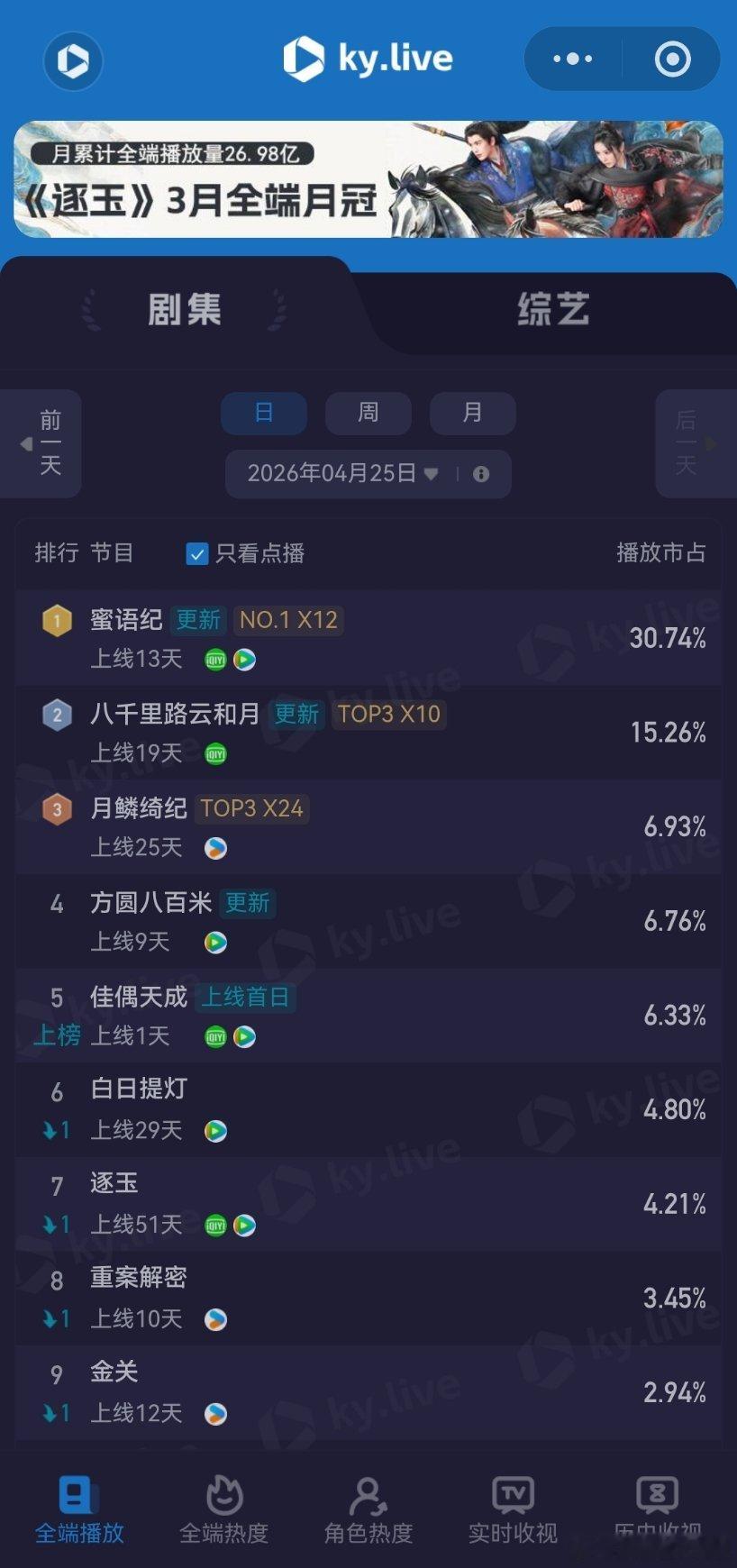 4月25日云合播放占比云合 VS酷云蜜语纪意外的强悍。佳偶天成没什么宣发的情况下有千万开局,算是很不错的成绩了。