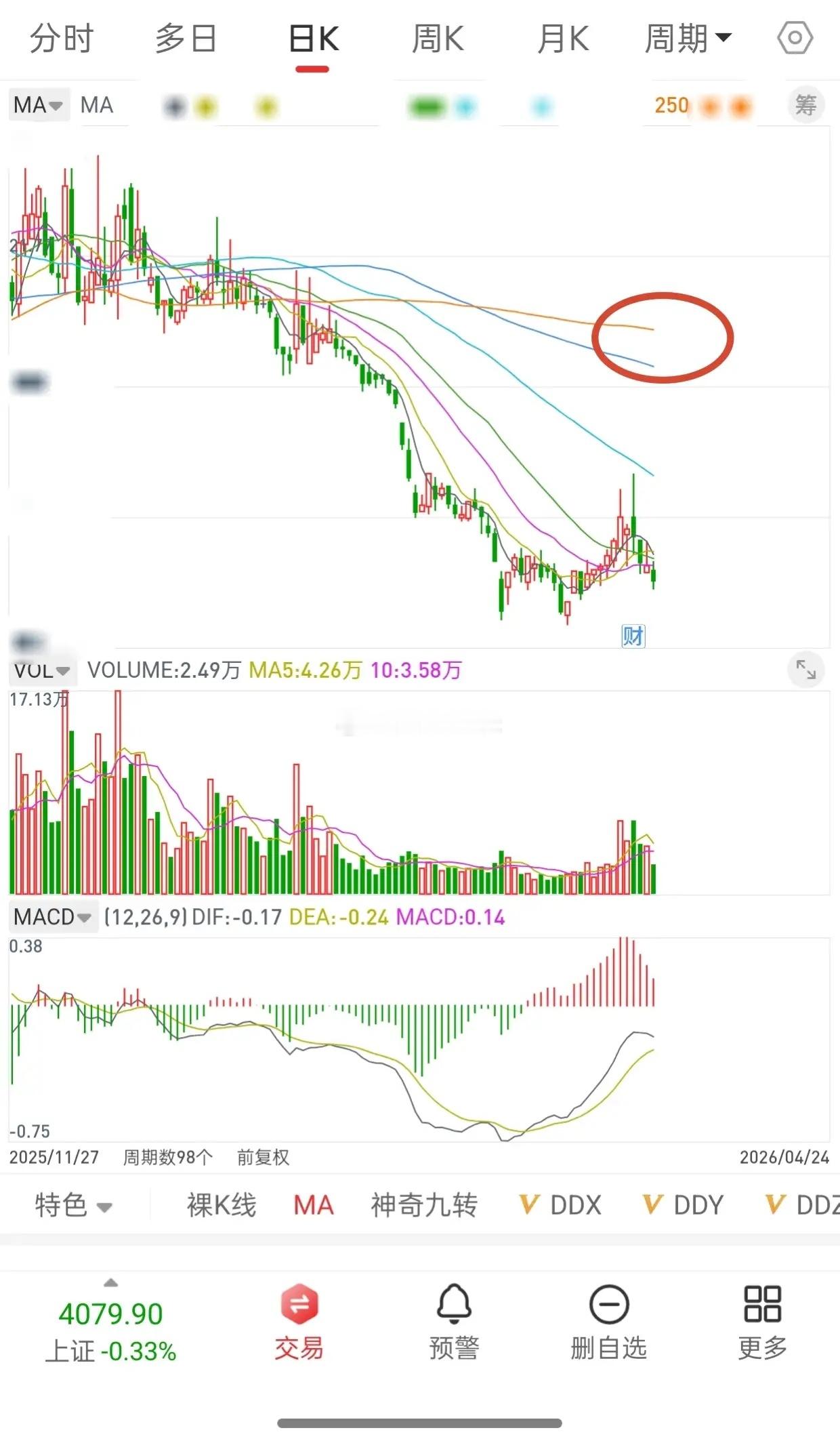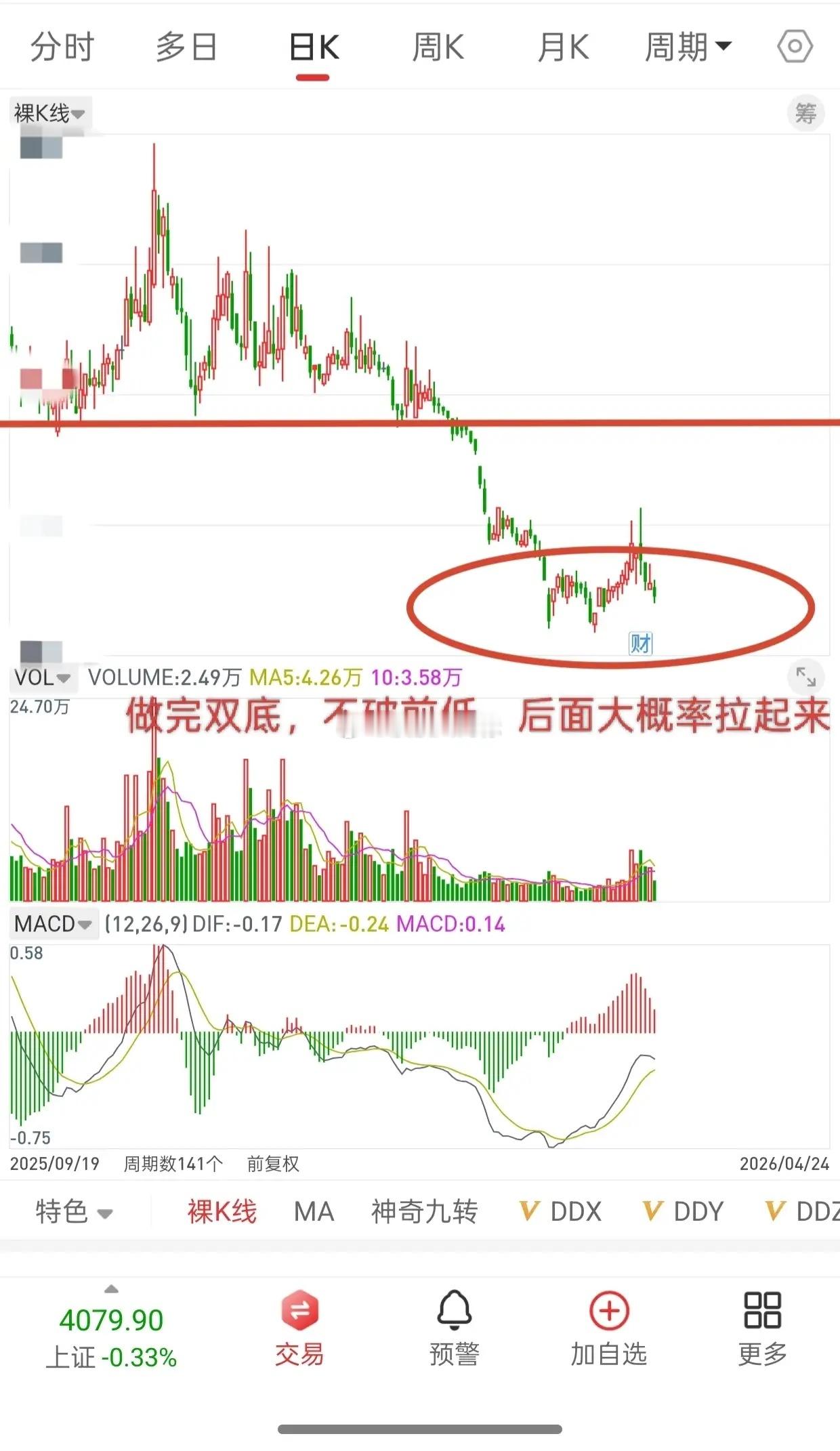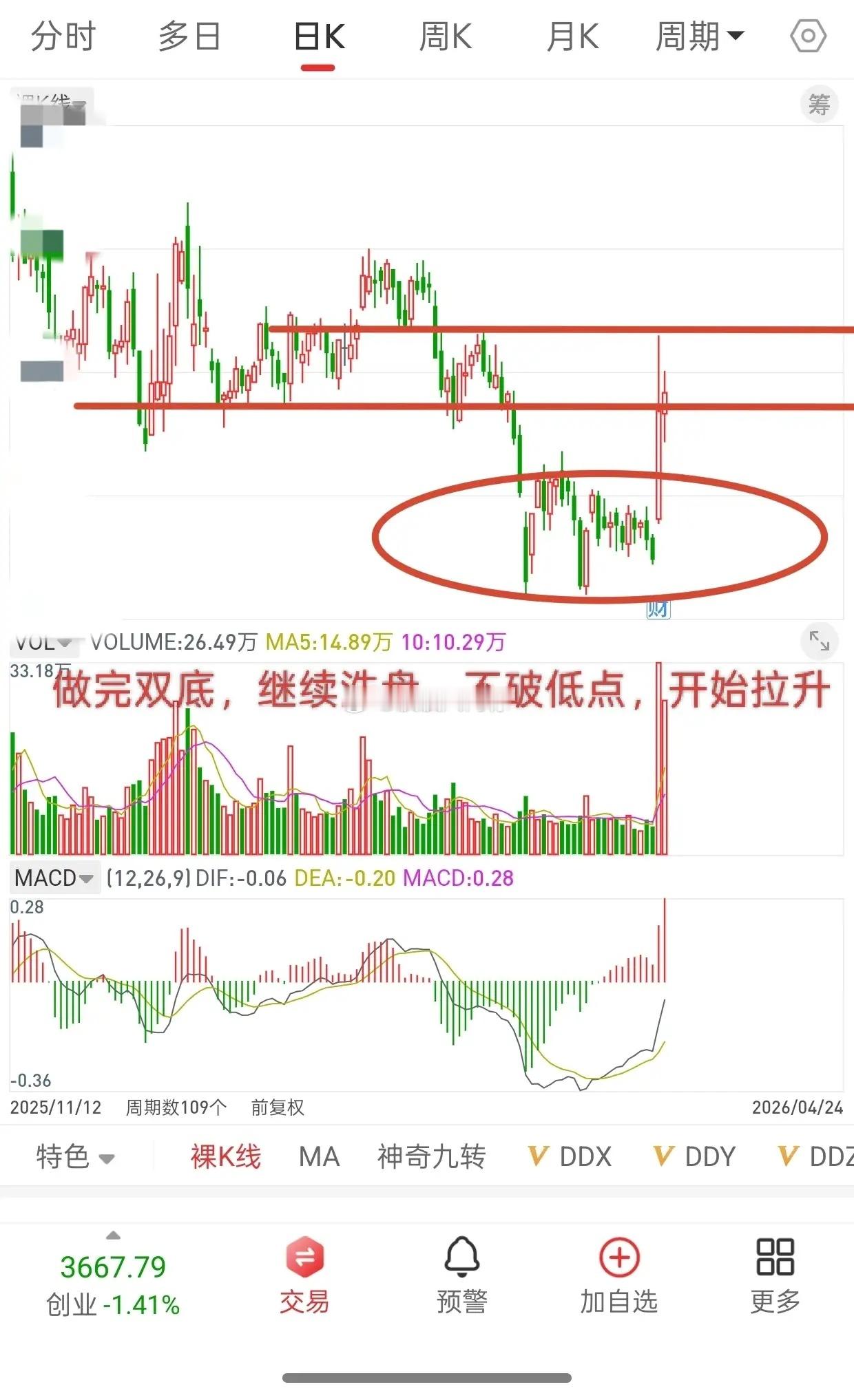 月K线出现这种走势,日K线基本前面跌破所有均线,然后日K线做双底,做完双底,再洗盘,洗盘不破低点,随时会大幅拉升,而日K线拉升高度可以看到年线,那时基本也到了前期套牢盘筹码密集区。