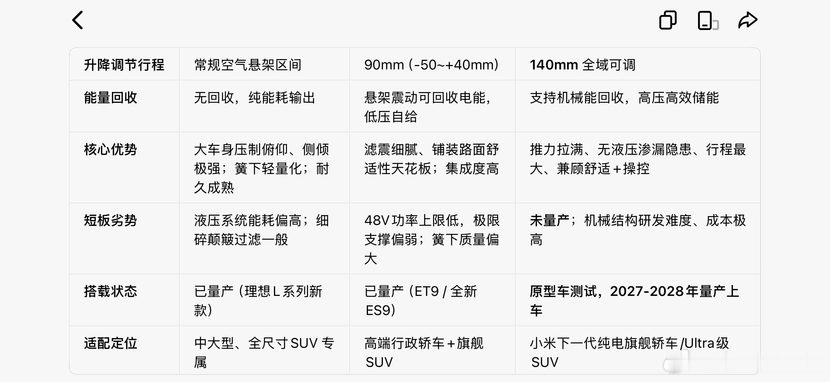 北京车展上的理想L9不用千斤顶靠主动悬挂换备胎火了,我详细对比蔚来,理想,小米(新蔚小理)三家全主动悬挂的技术参数,大家可以看看,一句话总结是:蔚来跑得最早,理想已经可以实现量产,还未量产的小米技术难度最高• 理想:800V 高压液压用中央液压泵驱动四轮执行器,靠高压获得大推力,没有能量回收。• 蔚来:48V 低压电液轮边电机+微型液压泵,靠高频微动作实现滤震,可回收少量电能自给。• 小米:800V 高压纯机械轮边大功率电机直驱,无液压系统,推力最大,同时支持机械能回收。以前我以为蔚来收购的ClearMotion(原Bose主动悬架团队)已经是世界领先了,没想到26、27年理想小米的国产800V主动悬架比蔚来还要猛,过不了几年,中国智能汽车才是真正的机器人行业,而做人形机器人的公司,在补贴退去之后会一地鸡毛智驾数码团