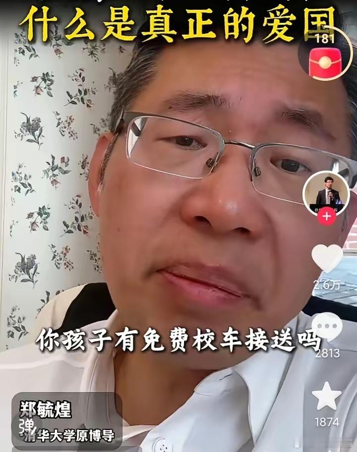 清华大学原博导郑毓煌说,爱国,不是爱这个国家,而是让这个国家变得更好更文明,郑教授说的文明国家三要素是:第一有免费校车接送,第二可以拦考斯特,第三,轻松见到市长,并抱市长的孩子,我个人认为,这三个文明的要求,有点匪夷所思啊,第一,我刚看到一个小视频,说日本孩子自己回家,从不用接送,说这才是文明,第二,我有病啊,非要拦考斯特,第三,我为什么要抱市长的孩子?我自己的孩子还没抱够呢,我们这里一个城市上千万人,轮也轮不到我啊,我明白了,郑教授想表达的观点是:我们确实不文明,短期内也文明不起来,所以不能爱国,大家怎么看这个问题呢?