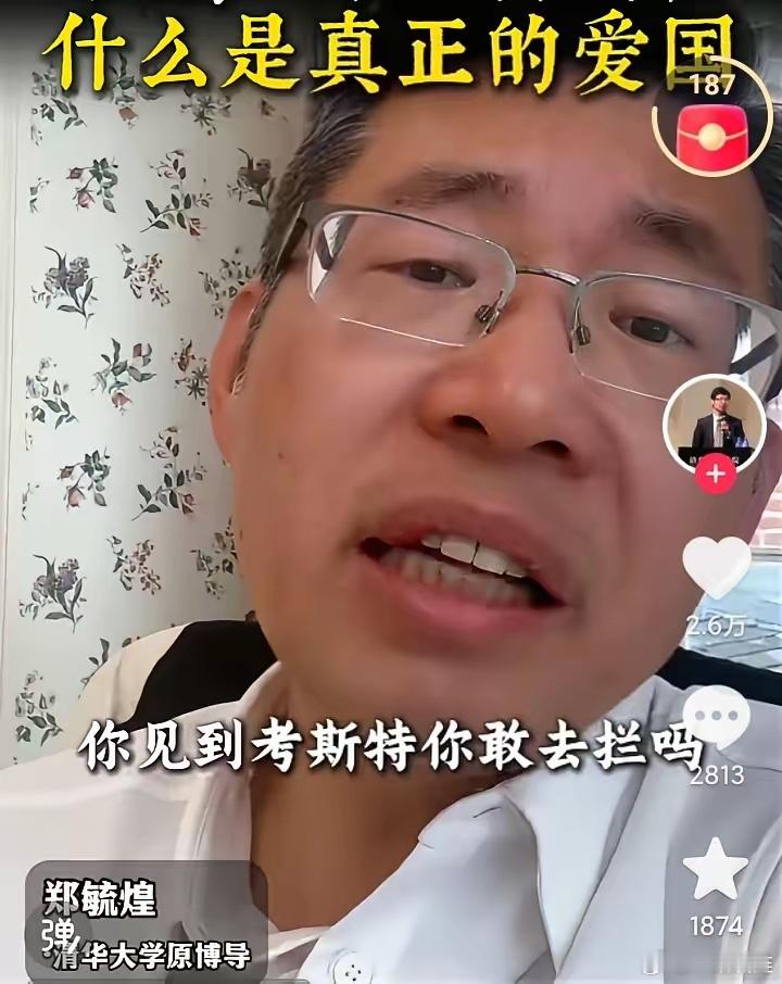清华大学原博导郑毓煌说,爱国,不是爱这个国家,而是让这个国家变得更好更文明,郑教