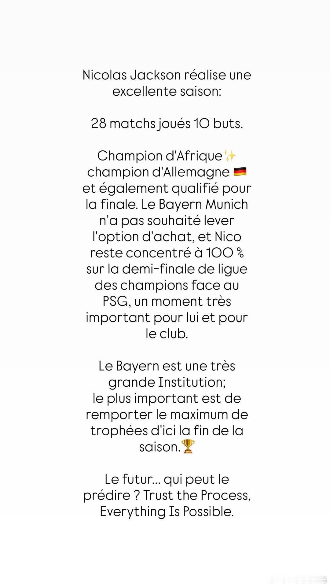 非洲冠軍和德國冠軍都已獲得,德國杯也晉級了決賽。拜仁慕尼黑最終沒有選擇行使買斷條款,不過尼科將百分之百專注於與巴黎聖日耳曼的歐冠半決賽,這對尼科和俱樂部來說都是一個非常重要的時刻。