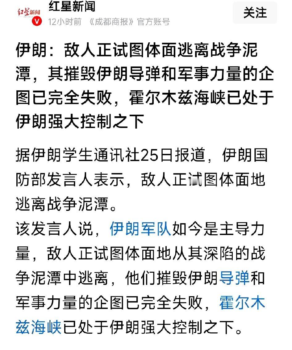 伊朗:敌人正试图体面逃离战争泥潭,其摧毁伊朗导弹和军事力量的企图已经完全失败了,霍尔木兹海峡已处于伊朗强大的控制之下。美国只是用了五分之一的海军扔炸弹,何来泥潭,伊朗连美军影子都没见到一个就被炸得魂飞魄散,何来力量。伊朗也就剩嘴巴了,从开头到后面都是威胁阿联酋,沙特,要打阿联酋,沙特。还挺能吹牛,现在伊朗石油都运不出来,商品又运不进去,双面封锁线誰最吃亏,一目了然。即便如此,不要有把美国重新拉回战争泥潭的任何行为,瘦死的骆驼比马大,不可大意。