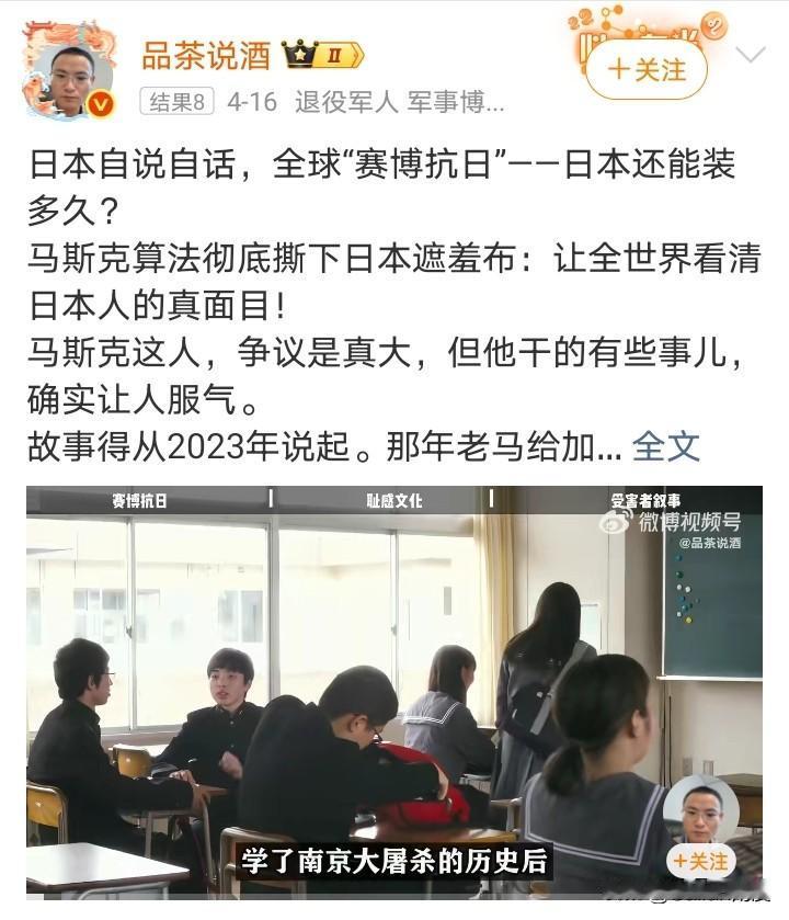 而马斯克把门一打开,大家发现:原来,在对外展示文明的背后,日本内部语境内,干的都是美化侵略战争,否认南京大屠杀,扭曲历史的叙述,甚至一些猥琐恶心的不堪行为!
