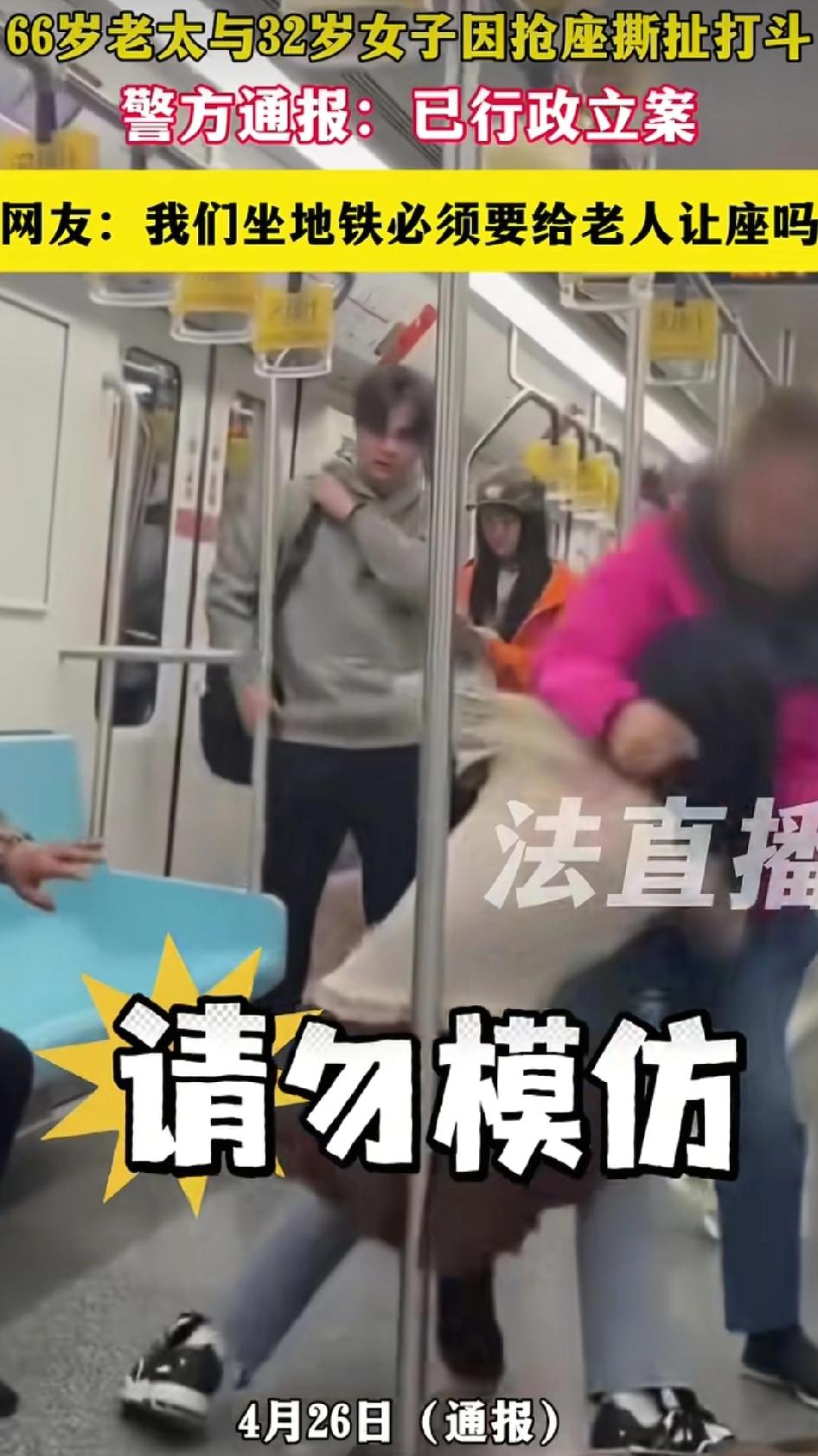 上海地铁1号线,一个空座,32岁女子和66岁大妈同时看上。年轻女子抢先坐下,大妈不干了:“你一个年轻人跟老年人抢座?”从口角到推搡,再到互相撕扯头发、扭打在地,最后双双进了派出所。