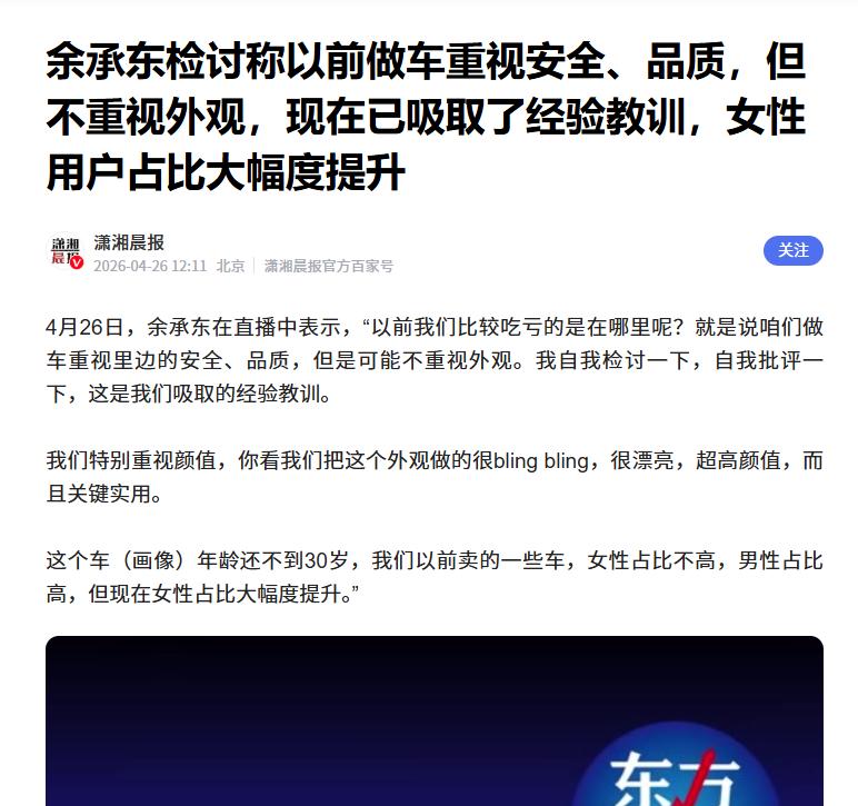 余承东直播时“自我检讨” 据媒体报道,近期在直播过程中,余承东“自我检讨”称:以前我们比较吃亏的是在哪里呢?就是说咱们做车重视里边的安全、品质,但是可能不重视外观。我自我检讨一下,自我批评一下,这是我们吸取的经验教训。