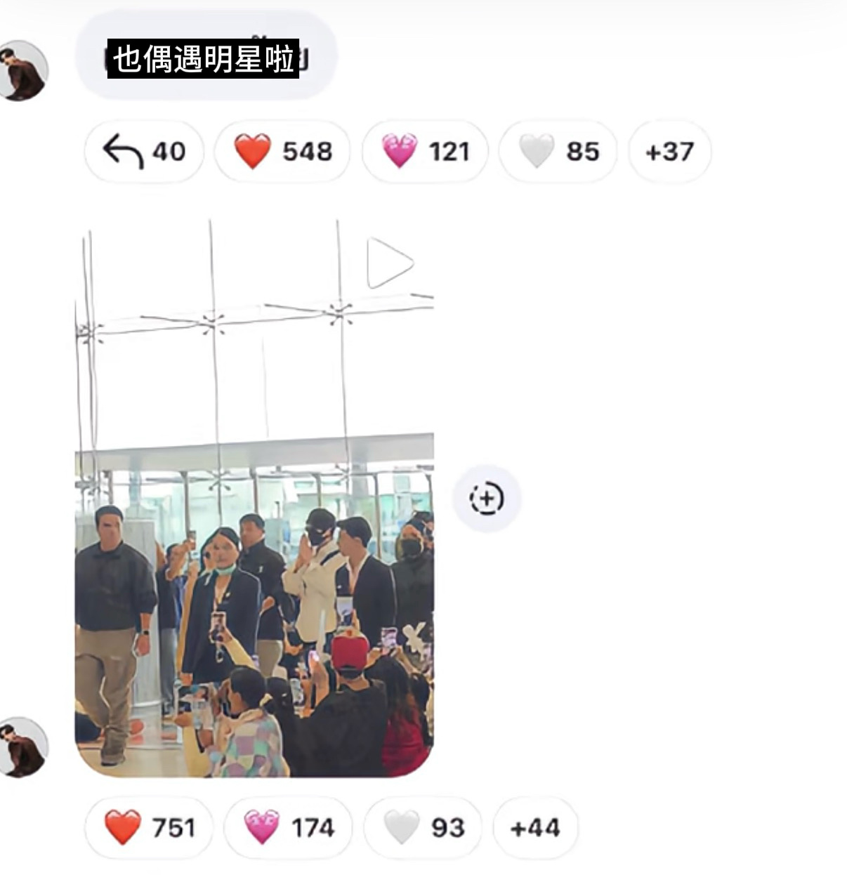 泰国演员在机场偶遇了丞磊还把视频发到了自己的粉丝群里并配文“也偶遇明星啦”