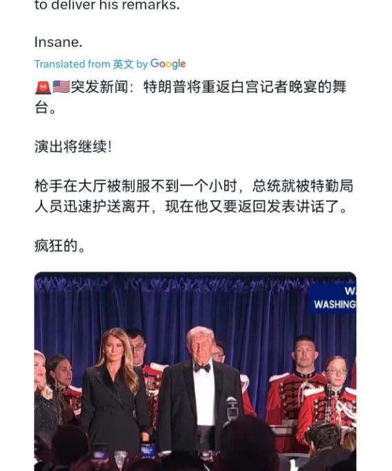 不得不说,特朗普是真爷们!在枪手刚被击毙之后,特朗普在白宫记者晚宴上重返舞台,并