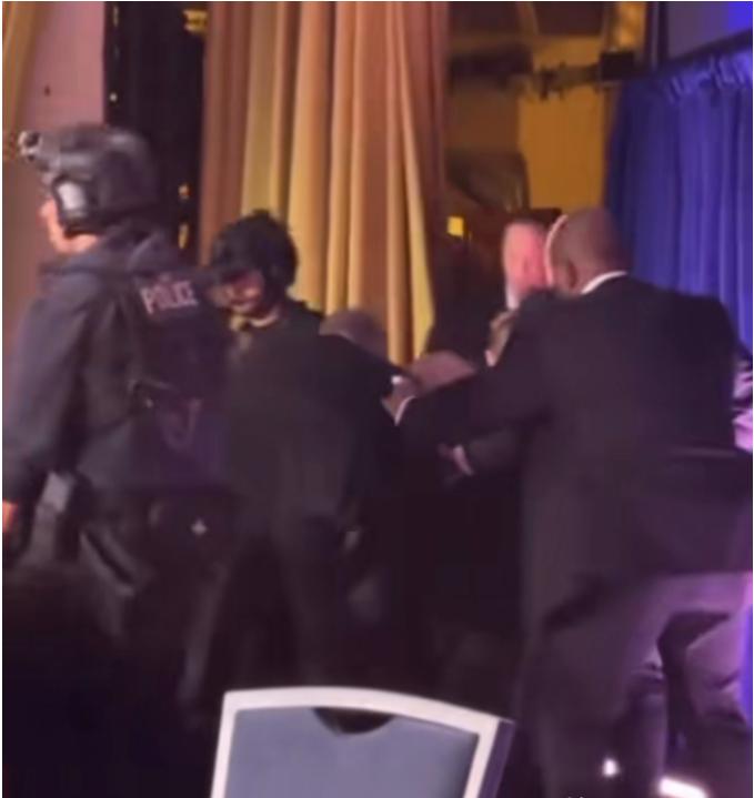 晚宴刚开始没多久,正当特朗普和记者们谈笑风生、享用晚餐时,一连串巨大的枪响突然划破宴会厅的宁静,紧接着就有人高喊“趴下”,现场瞬间陷入一片混乱。原本井然有序的晚宴,瞬间变成了人间炼狱般的逃亡现场。