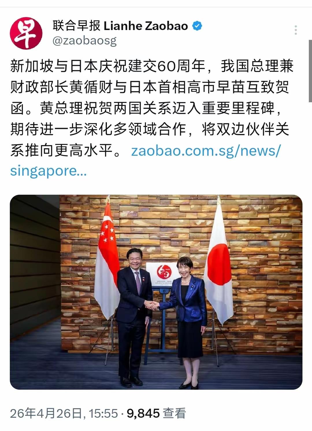 新加坡联合早报4月26日报道:“新加坡与日本庆祝建交60周年,我国总理兼财政部长黄循财与日本首相高市早苗互致贺函。黄总理祝贺两国关系迈入重要里程碑,期待进一步深化多领域合作,将双边伙伴关系推向更高水平。”