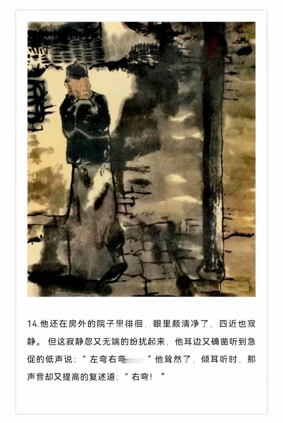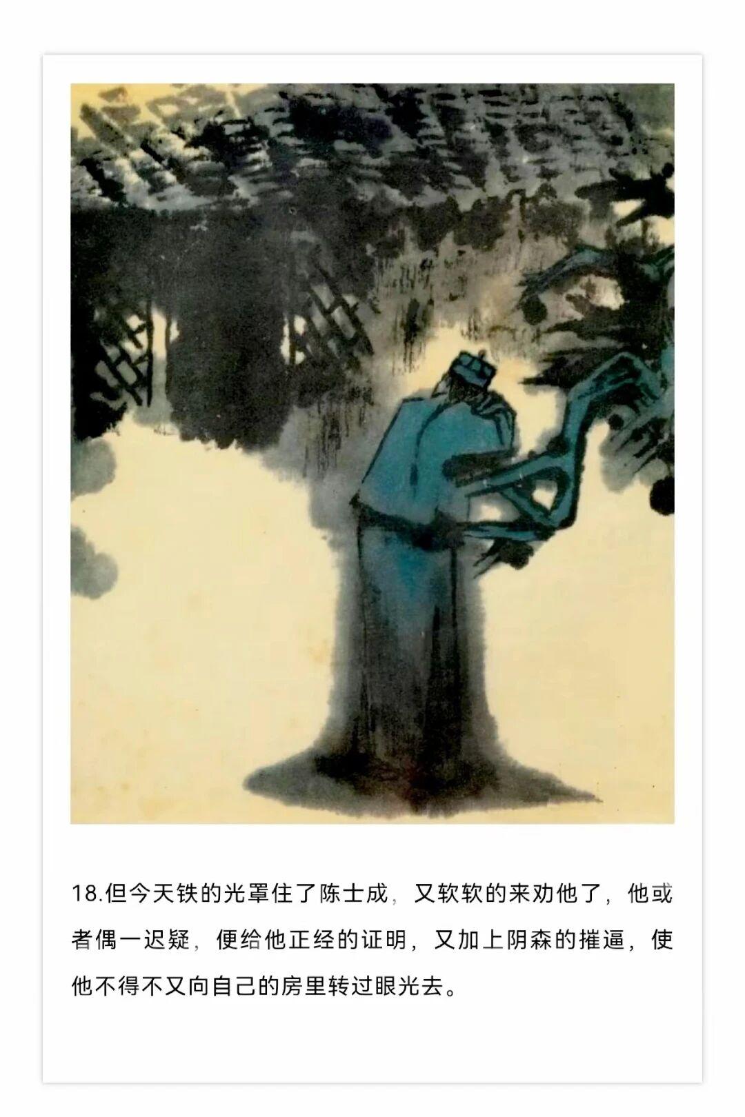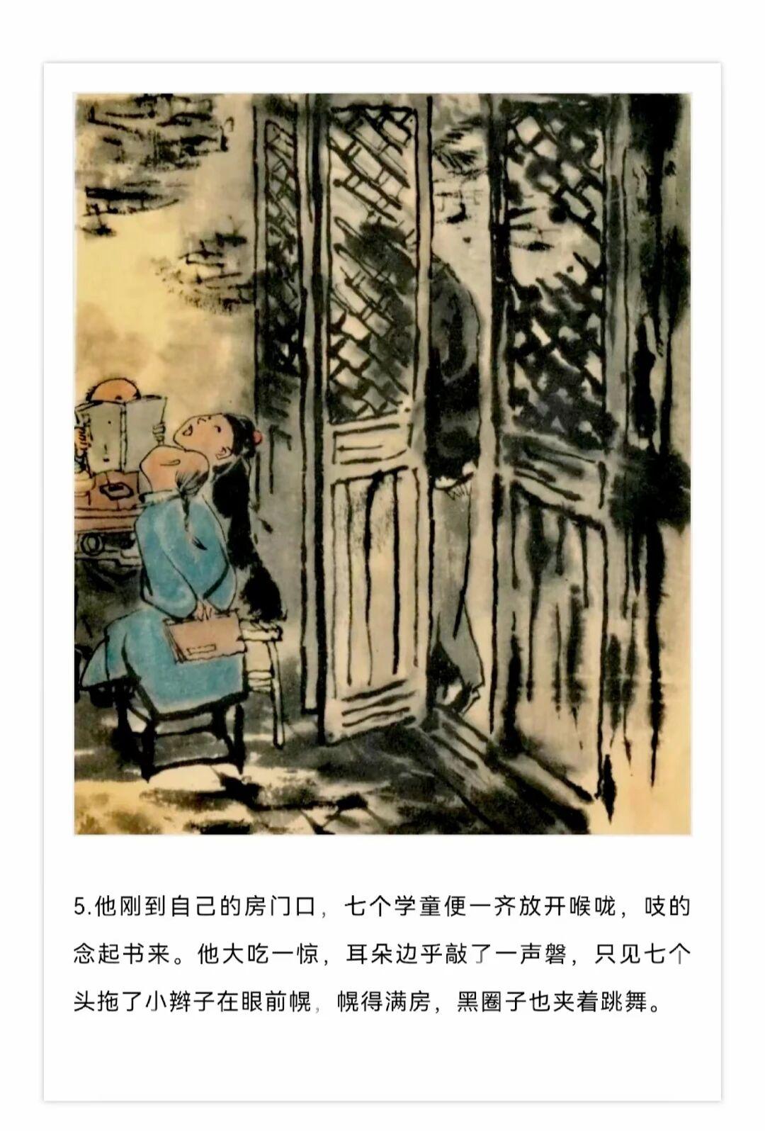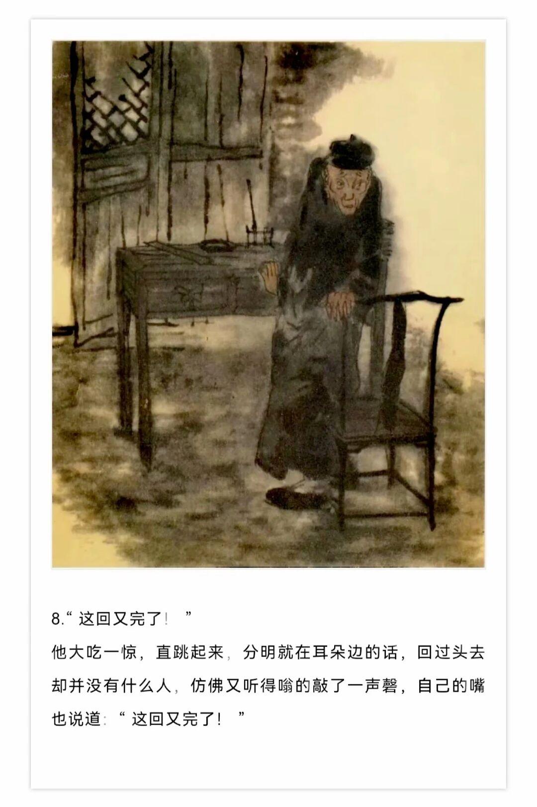 1980年贺友直用水墨写意风格创作了连环画《白光》,内容改编自鲁迅同名小说,描绘了老童生陈士成科举落第后精神崩溃的悲剧,贺友直用独特个构图和墨色浓淡变化营造出了阴郁压抑的氛围。