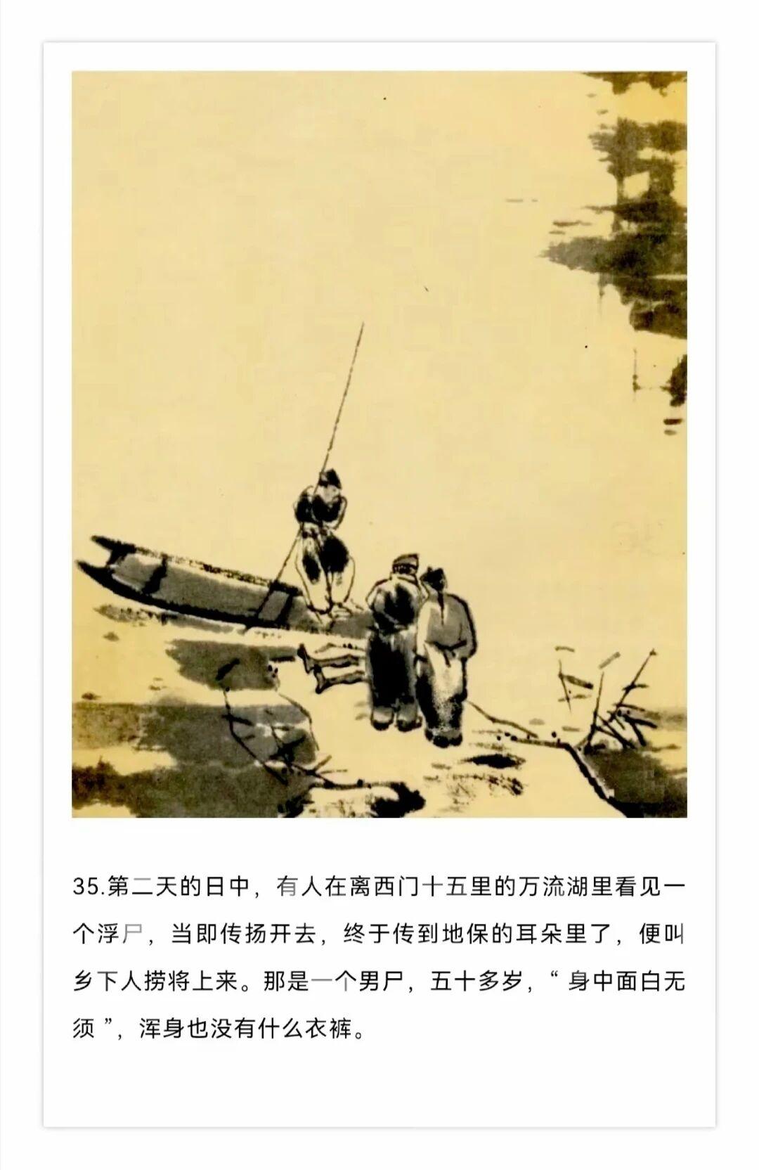 《白光》堪称中国连环画史上一次大胆的艺术突破。整部作品只有36幅画面,他将重点放在了人物刻画上,尤其是陈士成双眼的变化。从看榜时的焦灼到掘银时的癫狂,再到最后的绝望,那双眼睛的变化生动展现了人物心理的崩溃过程。贺友直还大胆运用留白和水墨淋漓的虚实效果,特别是在故事结尾,仅用简练笔触勾勒出两株枯芦苇和几圈水波,暗示主人公投湖自尽的结局,达到了无声胜有声的艺术境界。