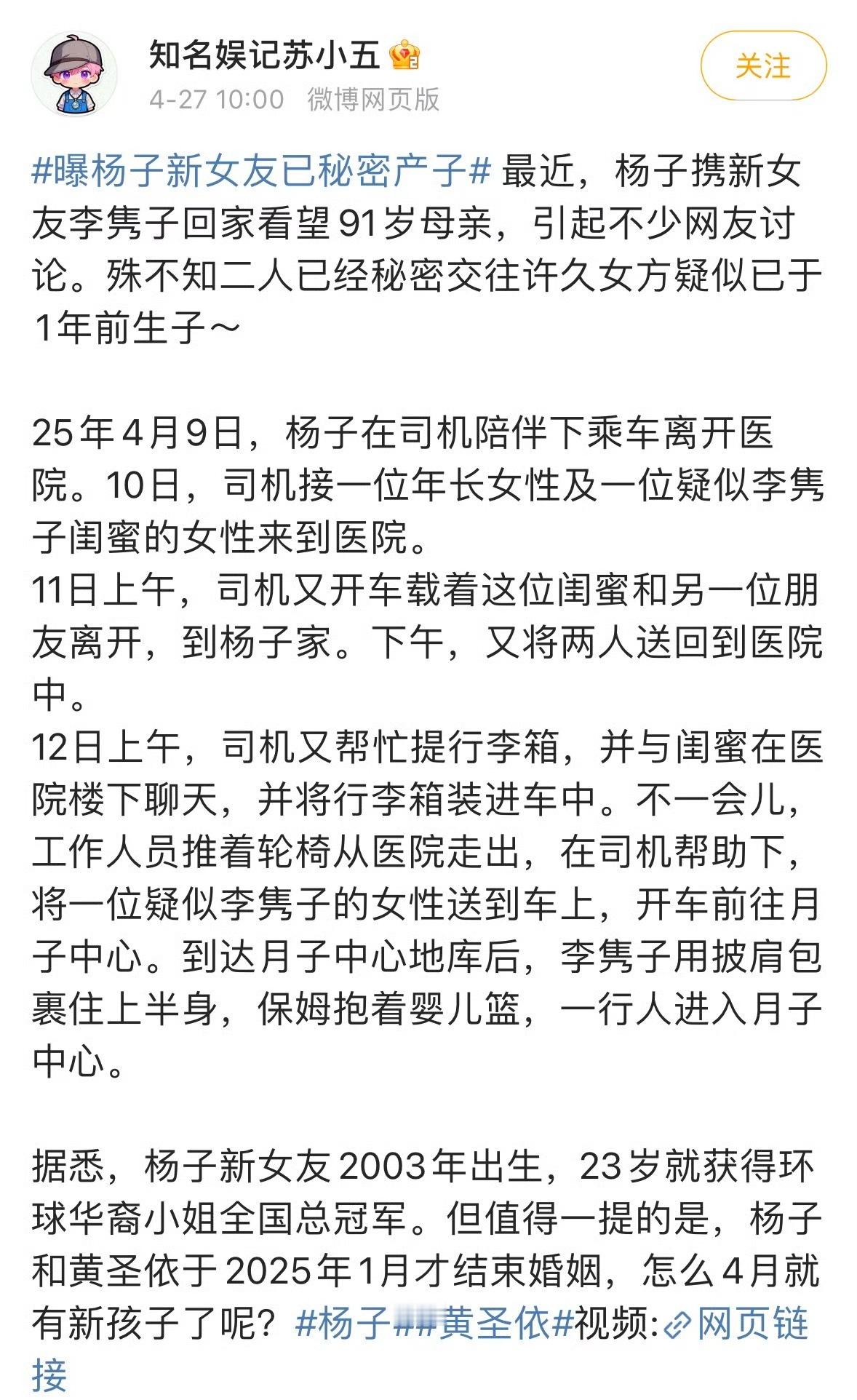 老牛吃嫩草!杨子新女友是03年的,已经在25年4月生子,离谱的是,杨子和黄圣依在
