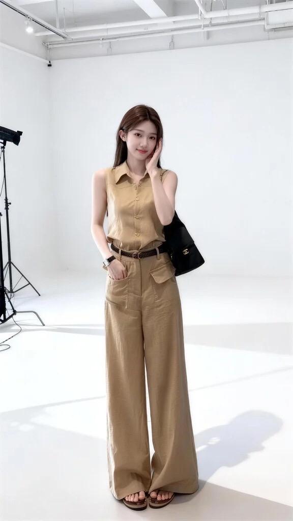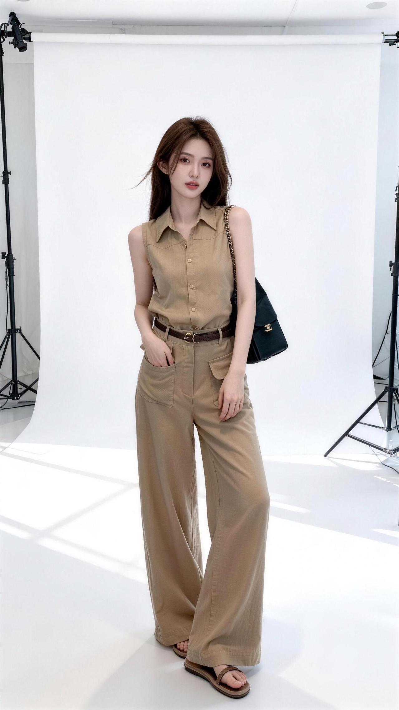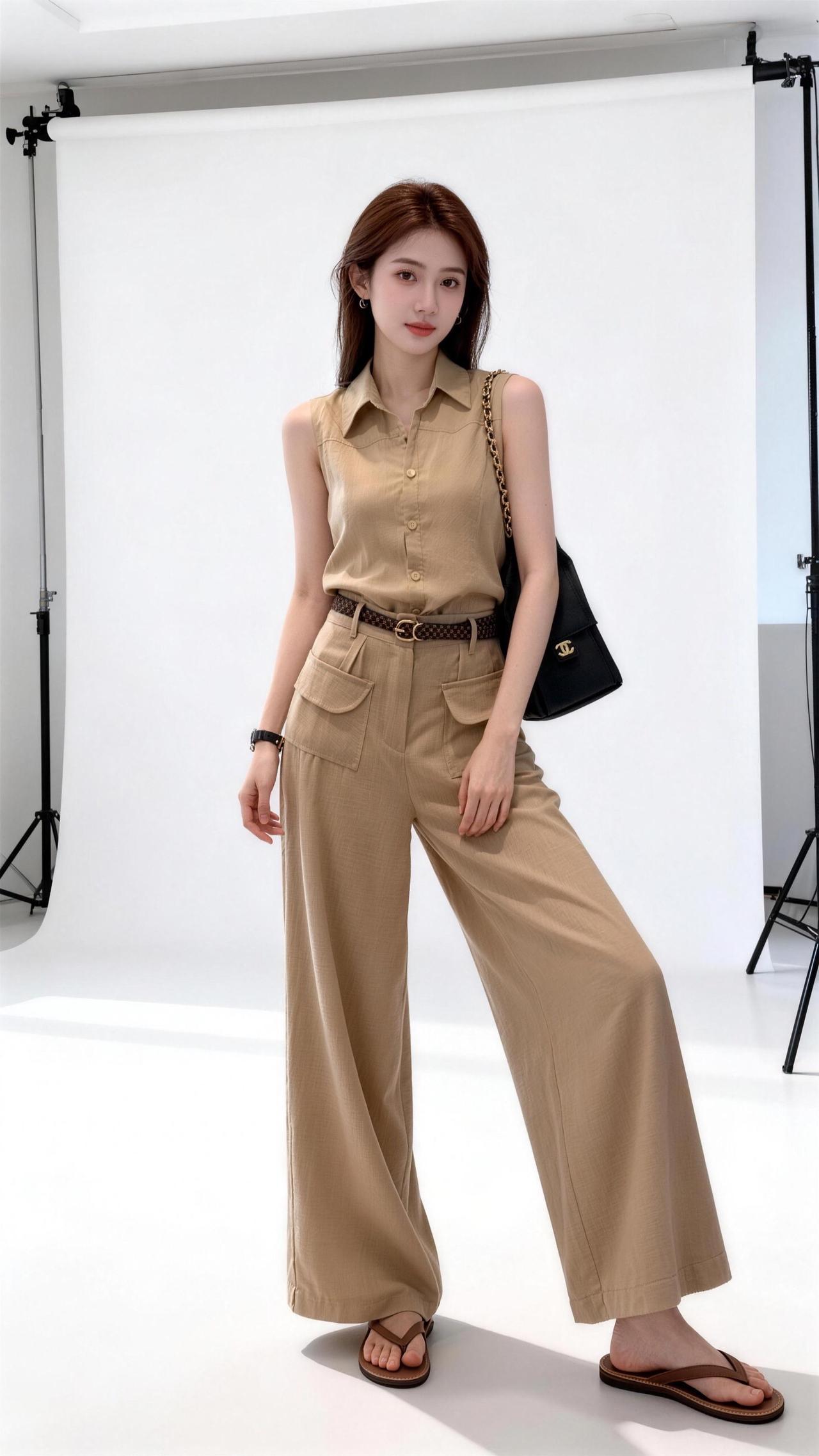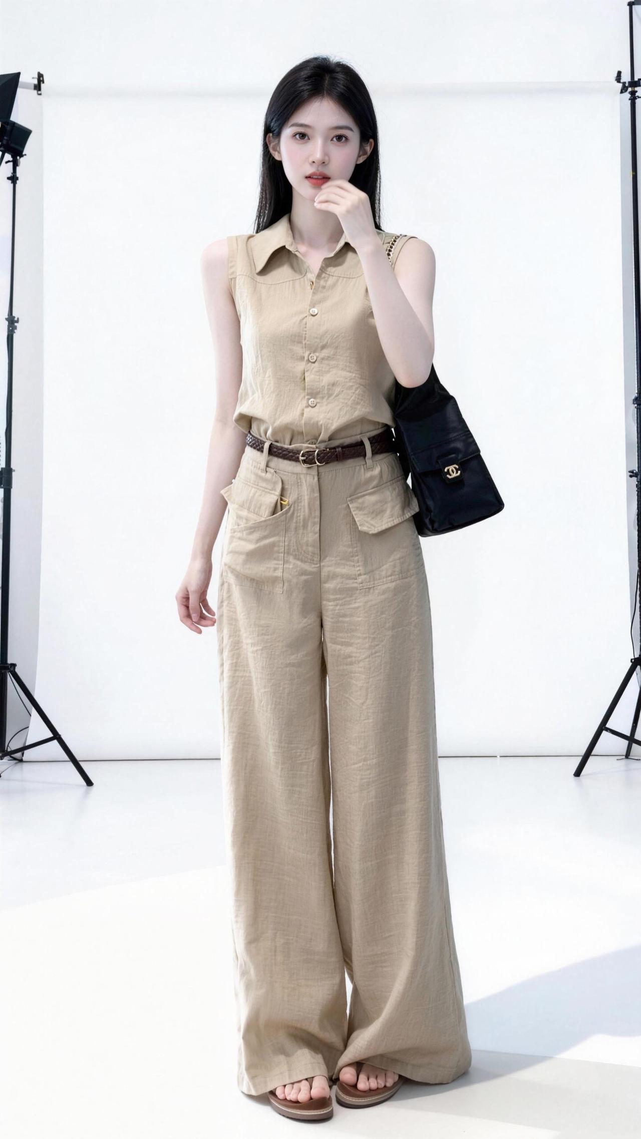 卡其色工装阔腿裤 夏季女生阔腿裤穿搭 背心阔腿裤穿搭 高腰卡其色阔腿裤 显瘦高腰马甲
