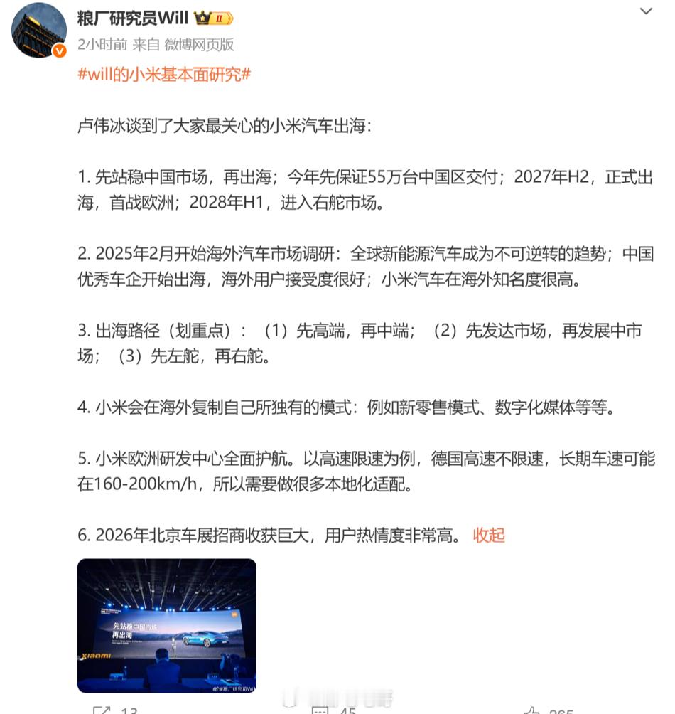 今天的小米投资者日上,卢伟冰谈到了小米汽车出海: