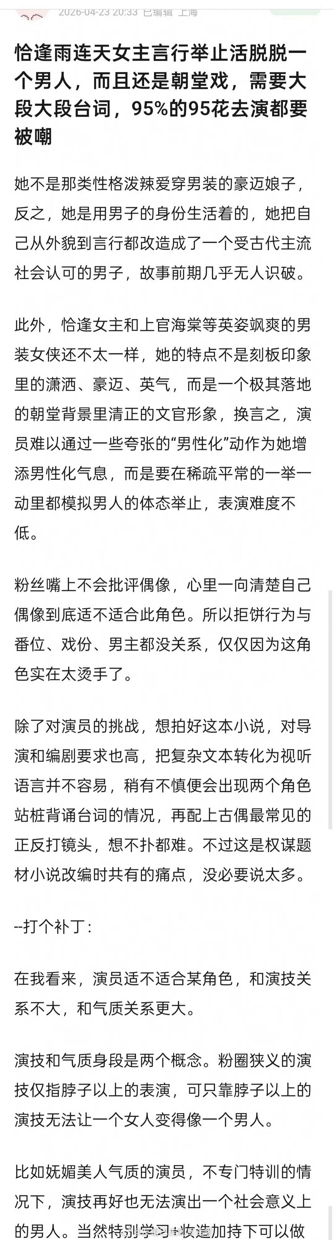 卢昱晓粉丝婉拒失败,对接确认接了《恰逢雨连天》之前就有人分析了这部剧95花不好演,卢昱晓本人也没那么贴,全程女扮男装粉丝也不喜欢,但是因为寒冬还是接了 卢昱晓方确认演恰逢雨连天 恰逢雨连天