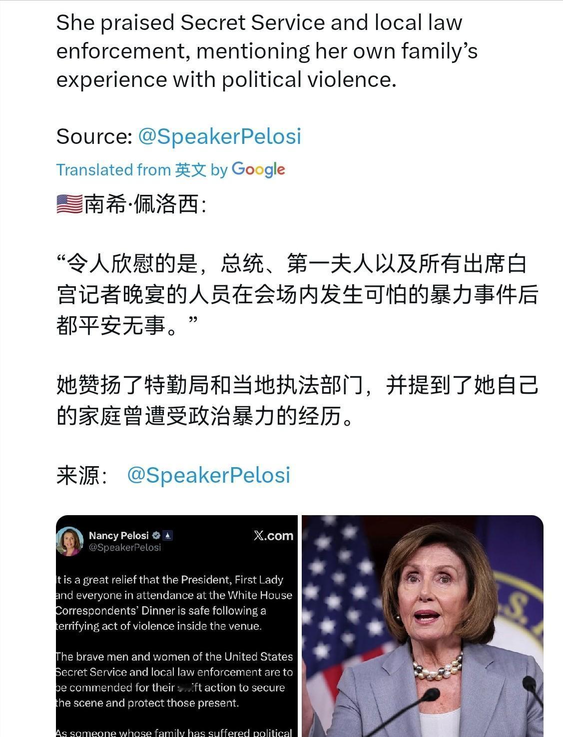 特朗普的死对头南希·佩洛西出来回应了!在枪击事件发生之后,佩洛西发表声明称,在这场发生在会场内的恶性暴力事件过后,总统、第一夫人以及出席白宫记者晚宴的所有人员均平安无事,这令人深感宽慰。