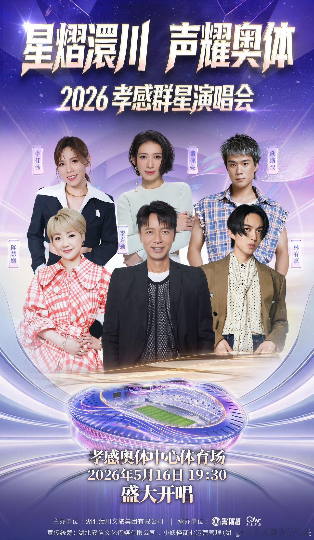 星熠澴川孝感群星演唱会要来了谁的DNA狠狠动了!从小听到大的《千千阙歌》《红日》《说谎》终于要在孝感大合唱了!陈慧娴、李克勤、林宥嘉、戴佩妮同台,这阵容真的梦幻到不敢信✨星熠澴川声耀奥体2026孝感群星演唱会