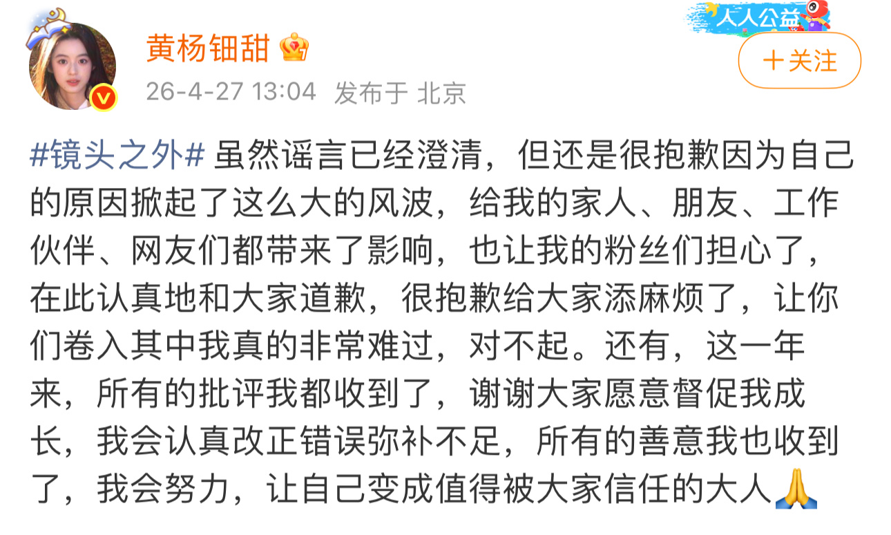 另外,黄杨钿甜也转发了采访正式道歉回应:“虽然谣言已经澄清,但还是很抱歉因为自己的原因掀起了这么大的风波,给我的家人、朋友、工作伙伴、网友们都带来了影响,也让我的粉丝们担心了,在此认真地和大家道歉,很抱歉给大家添麻烦了,让你们卷入其中我真的非常难过,对不起。”