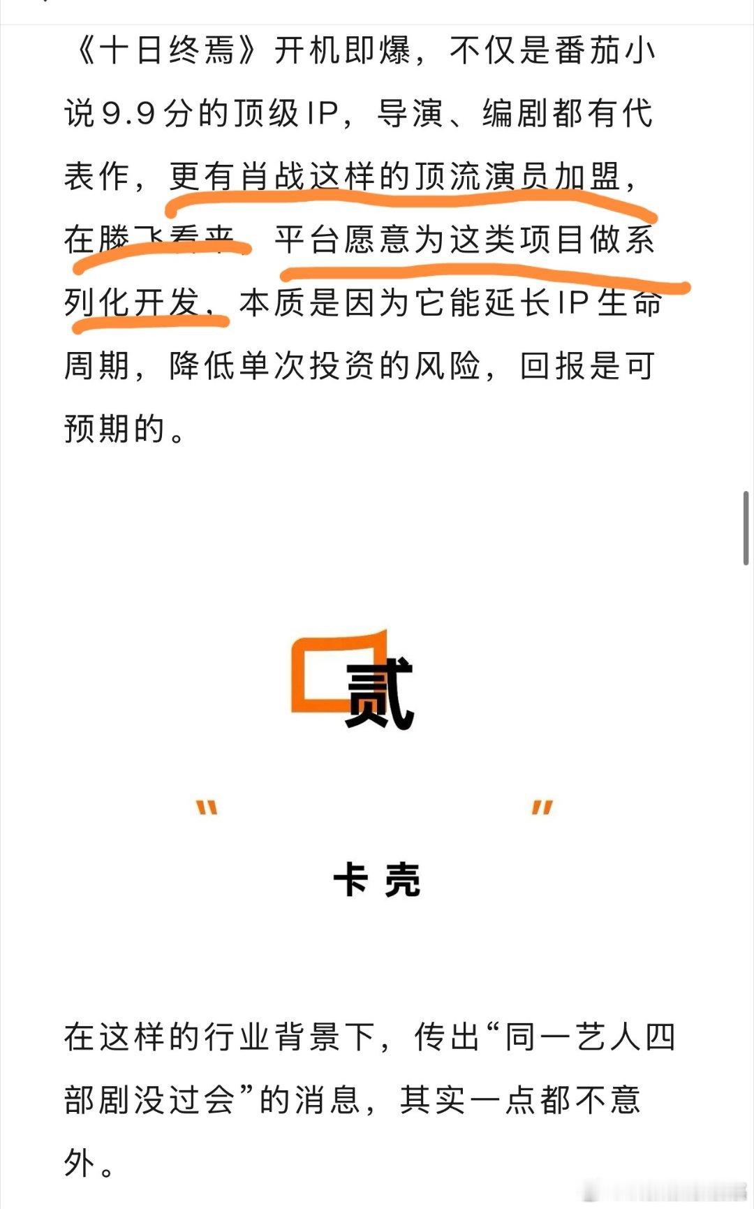 内娱进入开机冷静期狐厂这篇内娱进入开机冷静期文章明确提出平台的钱会给最稳妥的项目,比如十日终焉这种集齐最顶级ip、顶流演员肖战,导演和编剧都有代表作,平台愿意为它做系列化开发。
