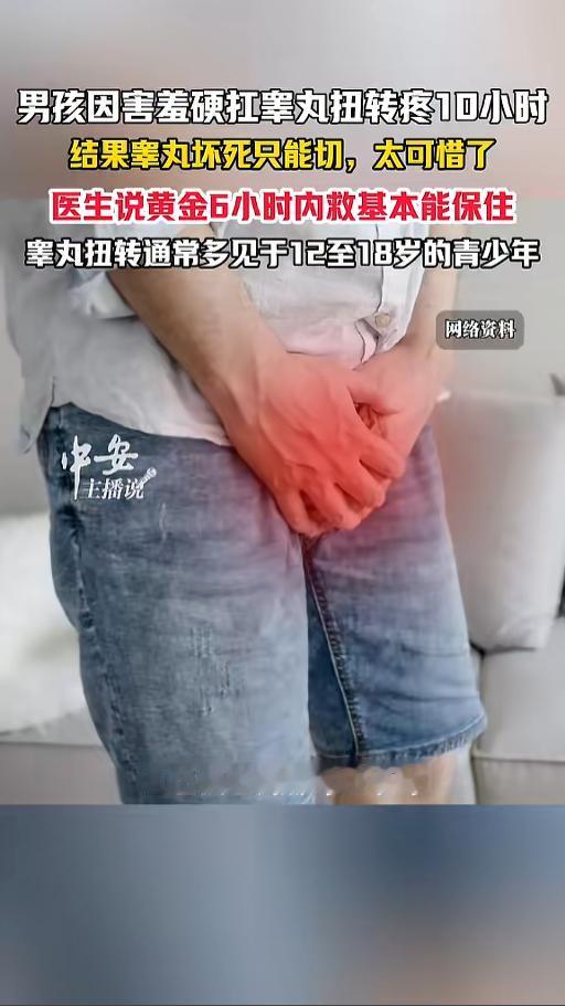“千万不要不好意思!”4月27日报道,重庆,一位17岁少年到医院就医,对医生言说自己肚子痛。医生越看越奇怪,最后追问之下,少年才说自己是下面的右边疼。他被确诊为睾丸扭转,可是已经坏死了,只能切除!网友:只有黄金6小时!